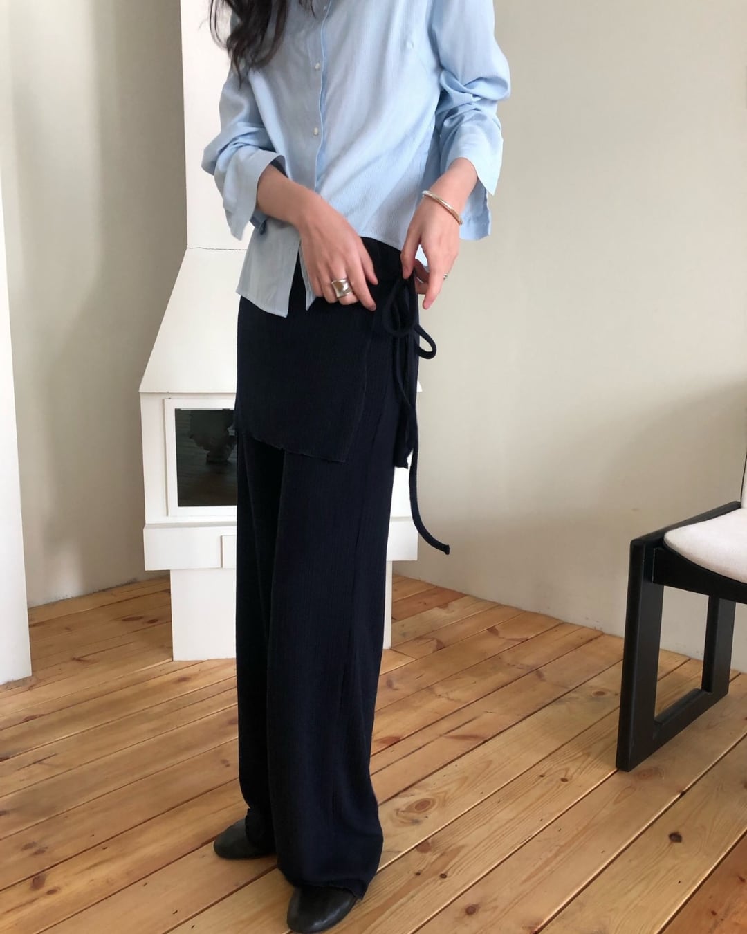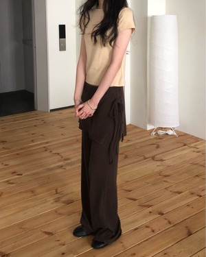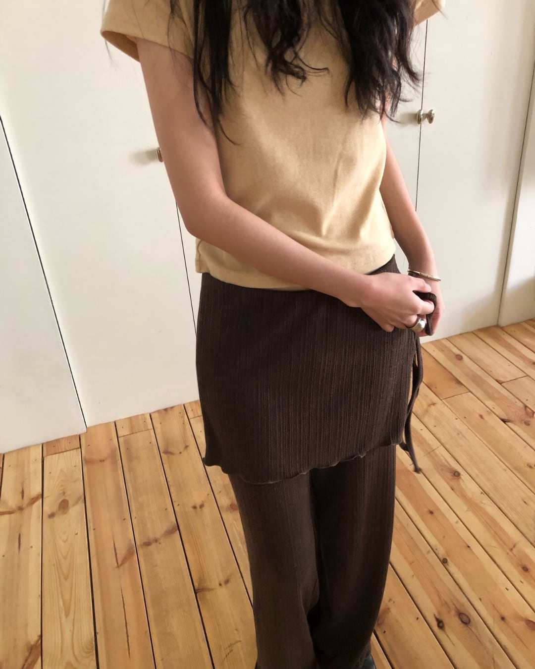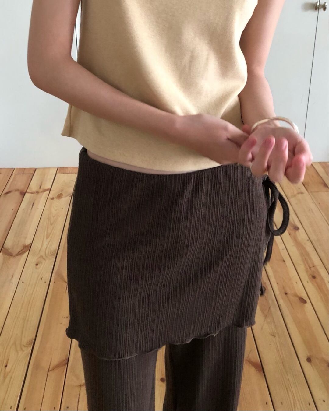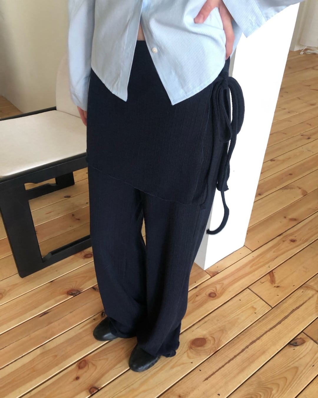 スカートを重ねたようなレイヤードデザインが魅力のワイドパンツ。縦リブ素材が縦ラインを強調し、スタイルアップ効果も抜群。程よく伸縮性のある生地でリラックスした履き心地ながら、こなれ感のある大人カジュアルスタイルを演出します。シンプルなトップスと合わせるだけでトレンド感のあるコーデが完成する一着です。
