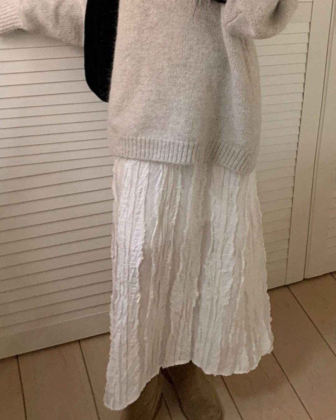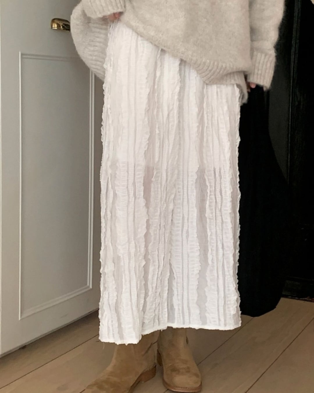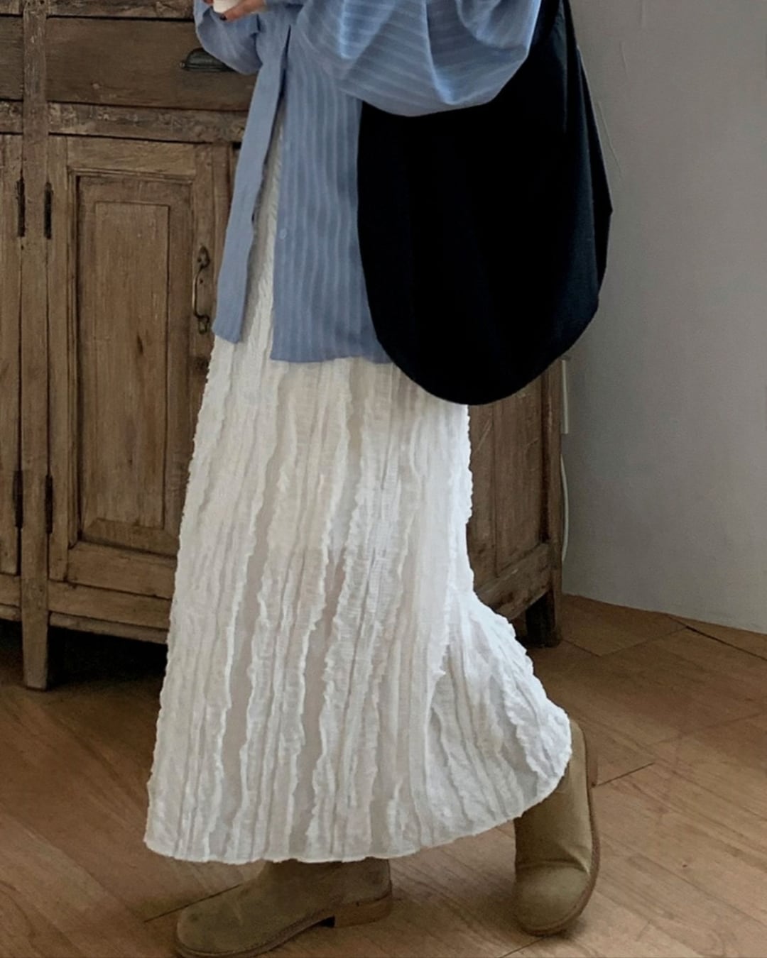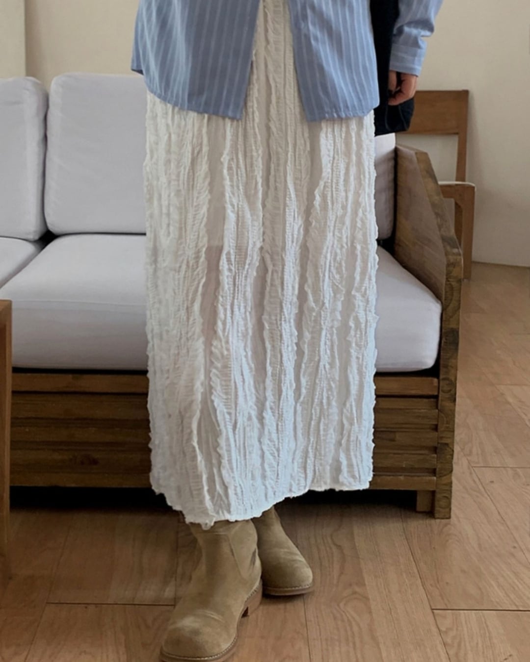 立体感のあるランダムプリーツが魅力のロングスカート。動くたびに表情が変わるデザインで、シンプルながらも存在感のある一着です。軽やかな素材感で履き心地も良く、ゆったりとしたシルエットが大人のリラックススタイルを演出。ニットやカットソーと合わせて、季節問わず活躍します。