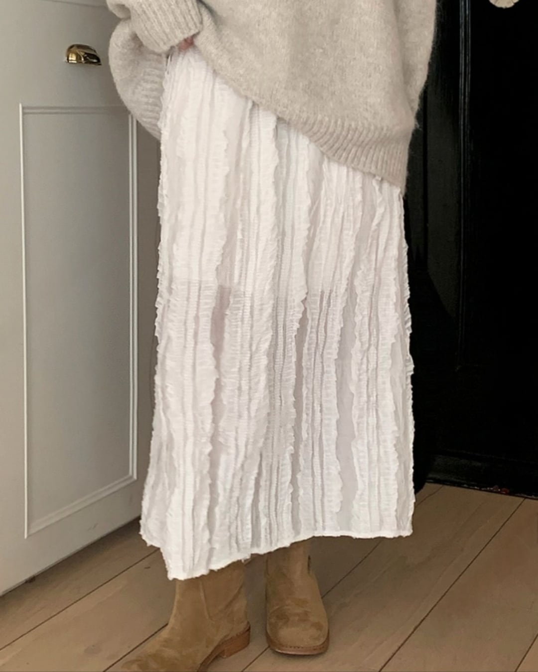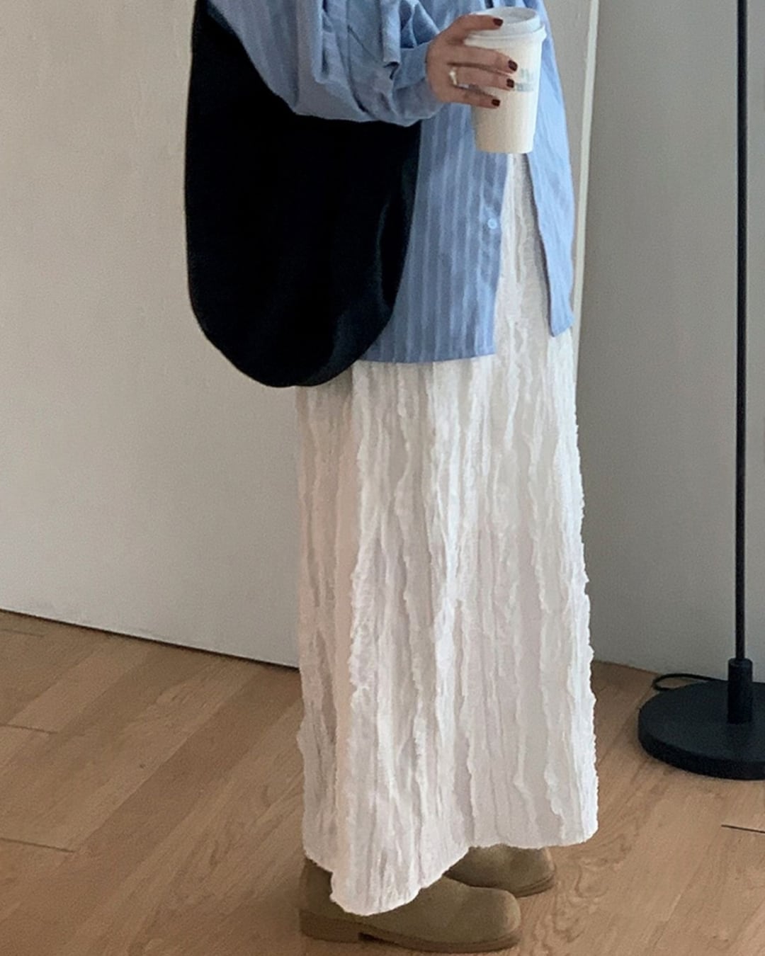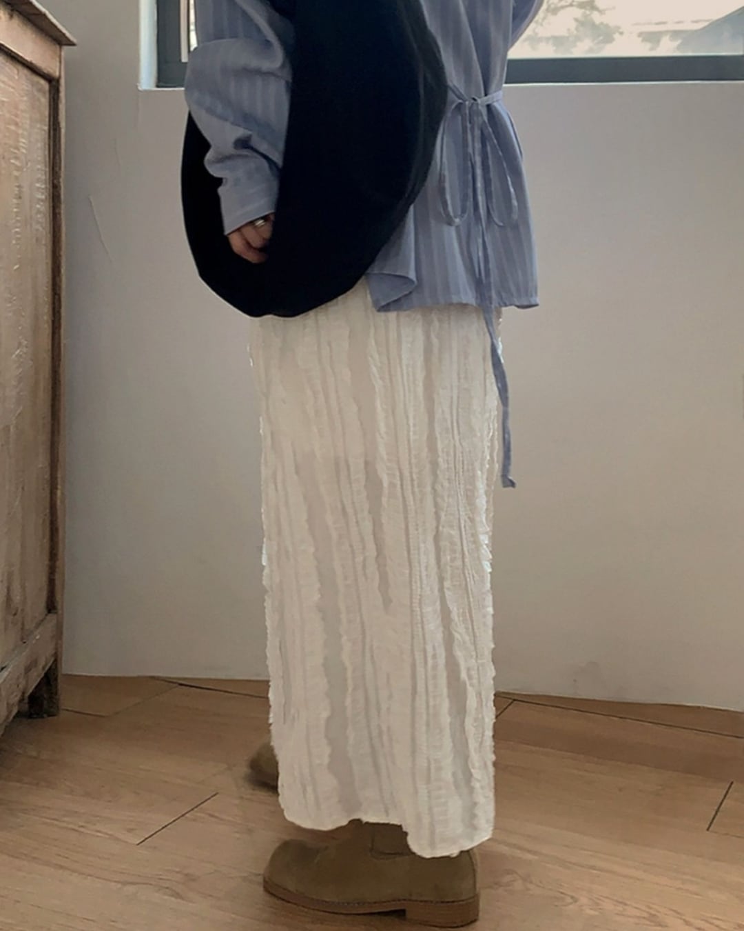 立体感のあるランダムプリーツが魅力のロングスカート。動くたびに表情が変わるデザインで、シンプルながらも存在感のある一着です。軽やかな素材感で履き心地も良く、ゆったりとしたシルエットが大人のリラックススタイルを演出。ニットやカットソーと合わせて、季節問わず活躍します。