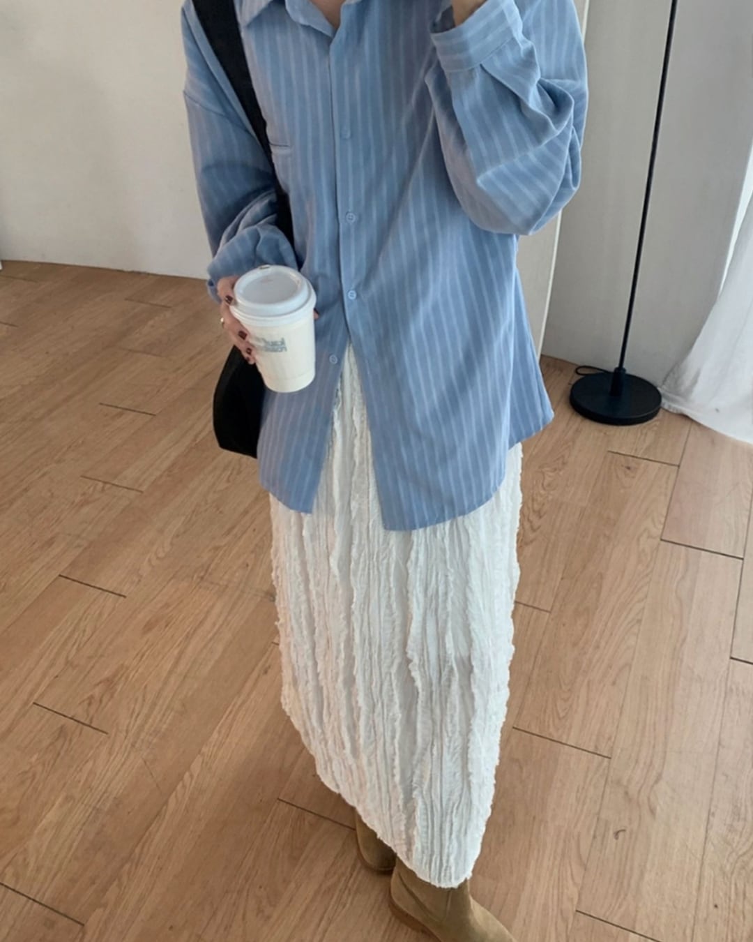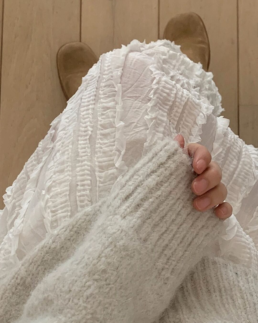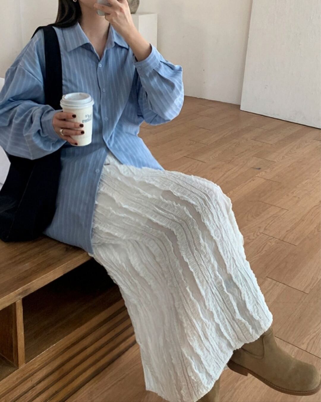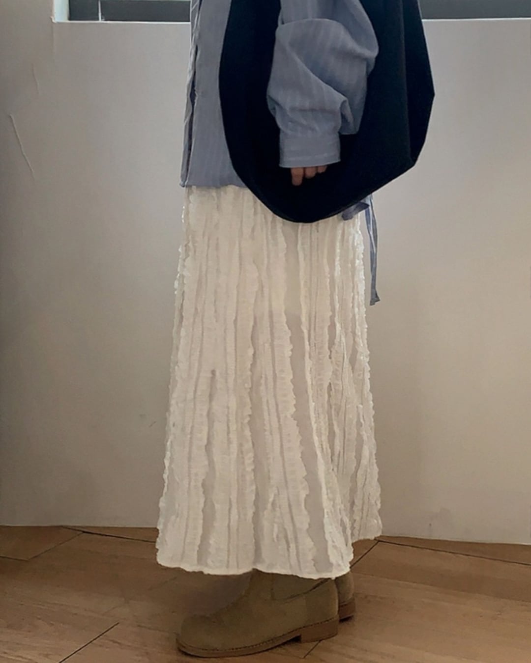 立体感のあるランダムプリーツが魅力のロングスカート。動くたびに表情が変わるデザインで、シンプルながらも存在感のある一着です。軽やかな素材感で履き心地も良く、ゆったりとしたシルエットが大人のリラックススタイルを演出。ニットやカットソーと合わせて、季節問わず活躍します。