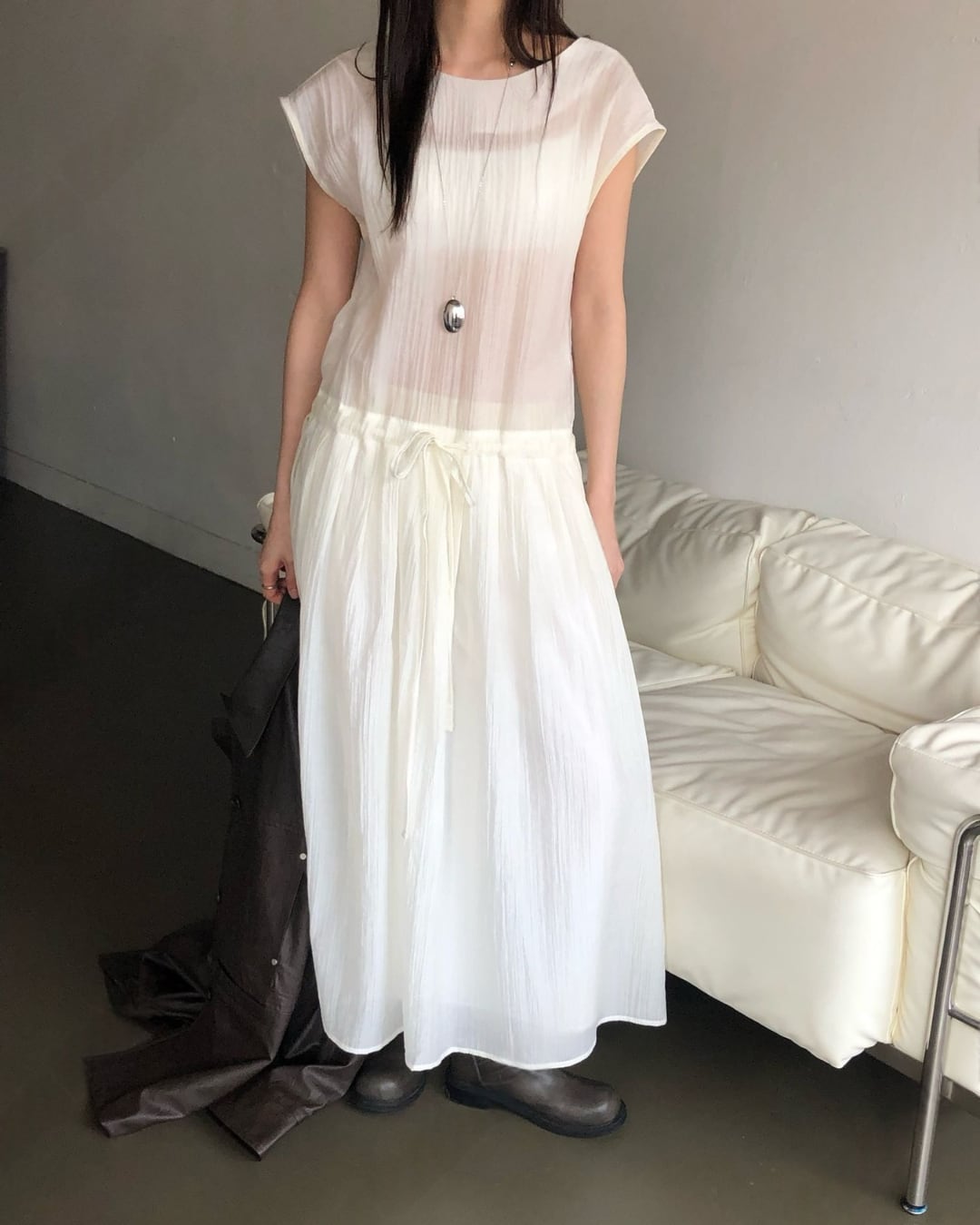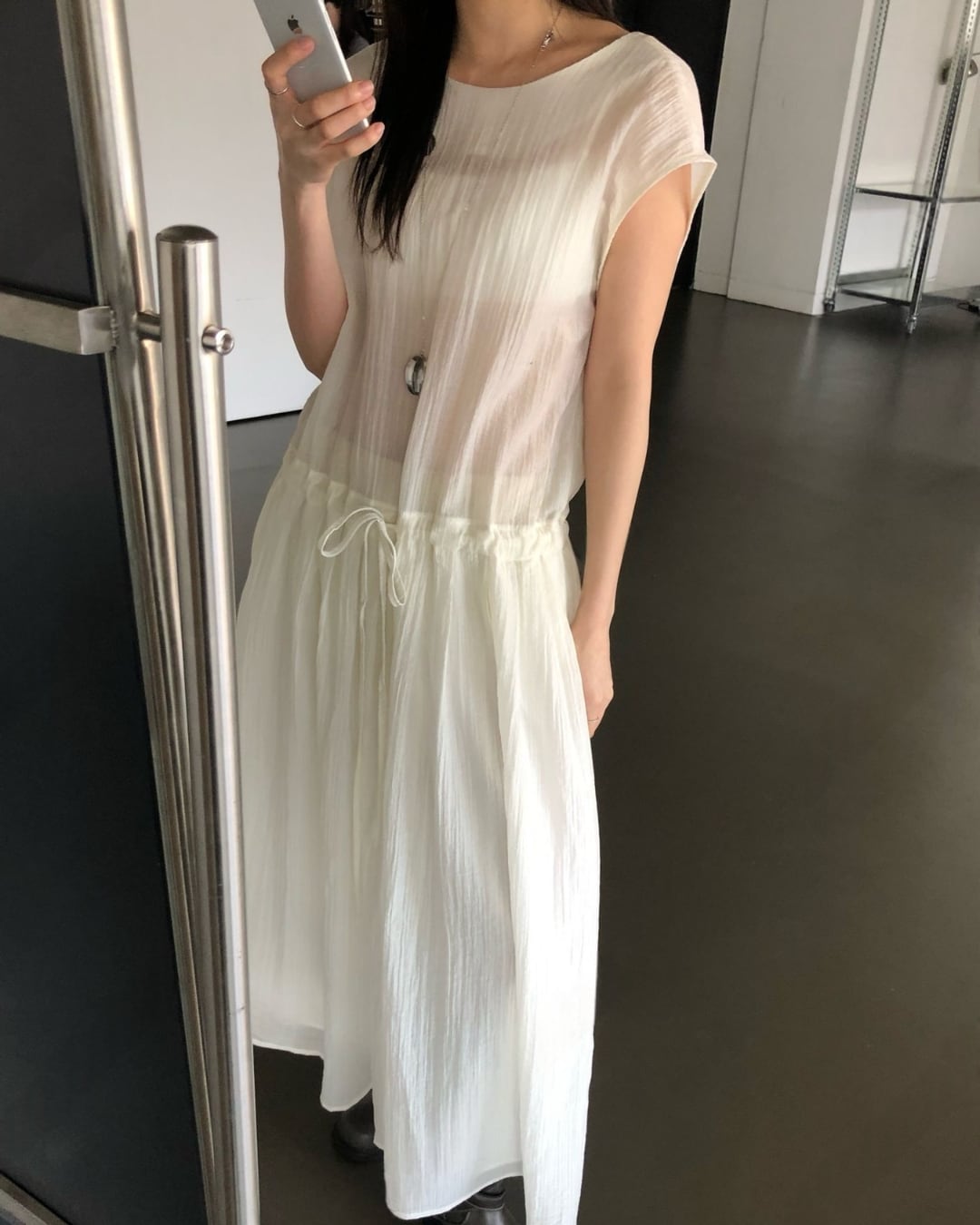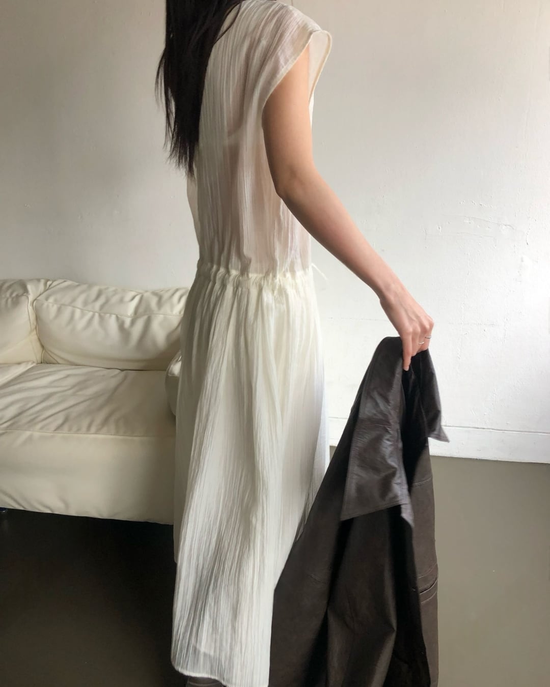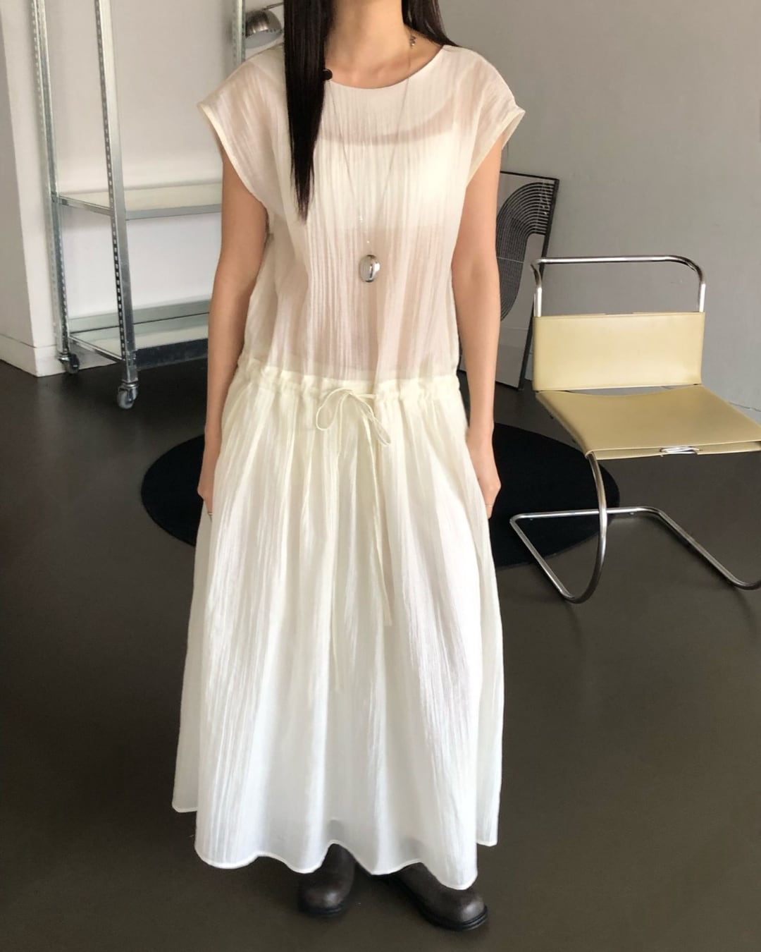 #シアーワンピース #プリーツワンピース #ドローストリング #ナチュラルコーデ #ロングワンピース