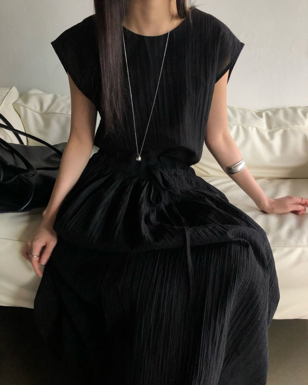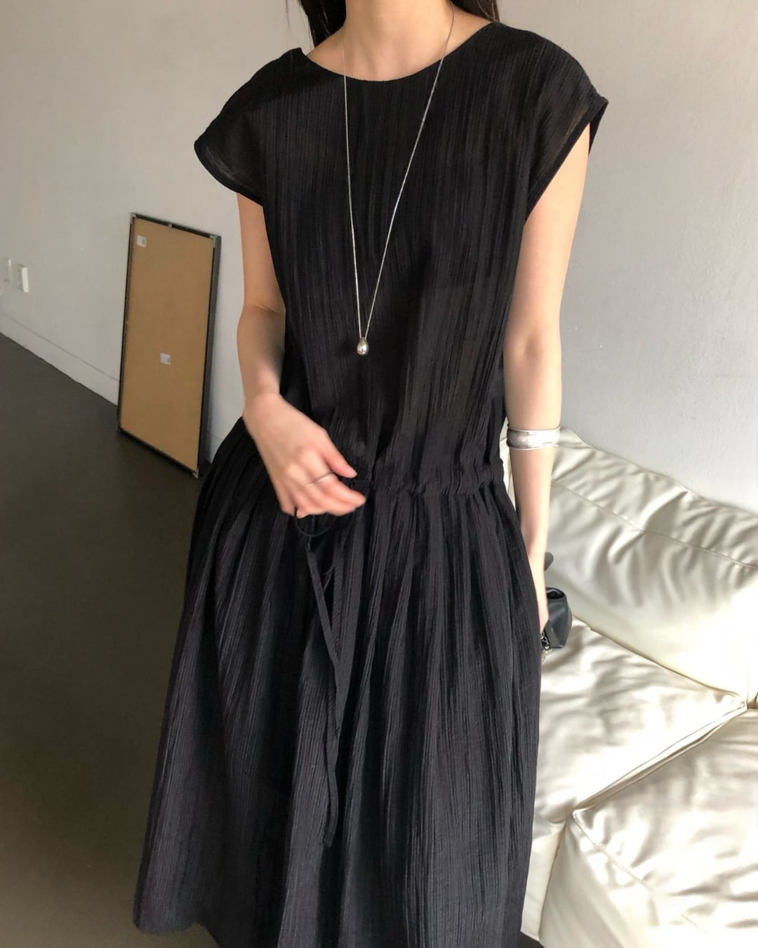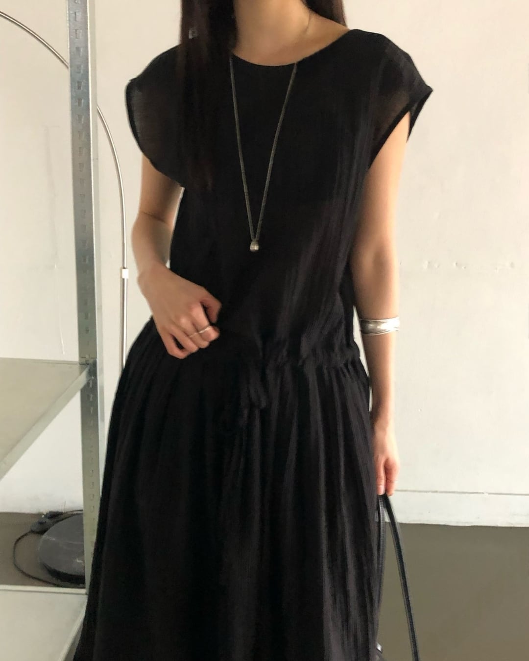 柔らかなシアー素材が魅力のプリーツワンピース。縦に入った繊細なプリーツが縦長シルエットを演出し、すっきりとした印象に仕上げてくれます。ウエスト部分はドローストリング仕様で、お好みのシルエットに調整可能。軽やかで抜け感のあるデザインは、1枚でコーデが完成する大人ナチュラルなアイテムです。