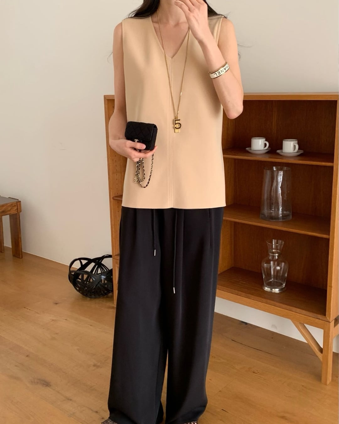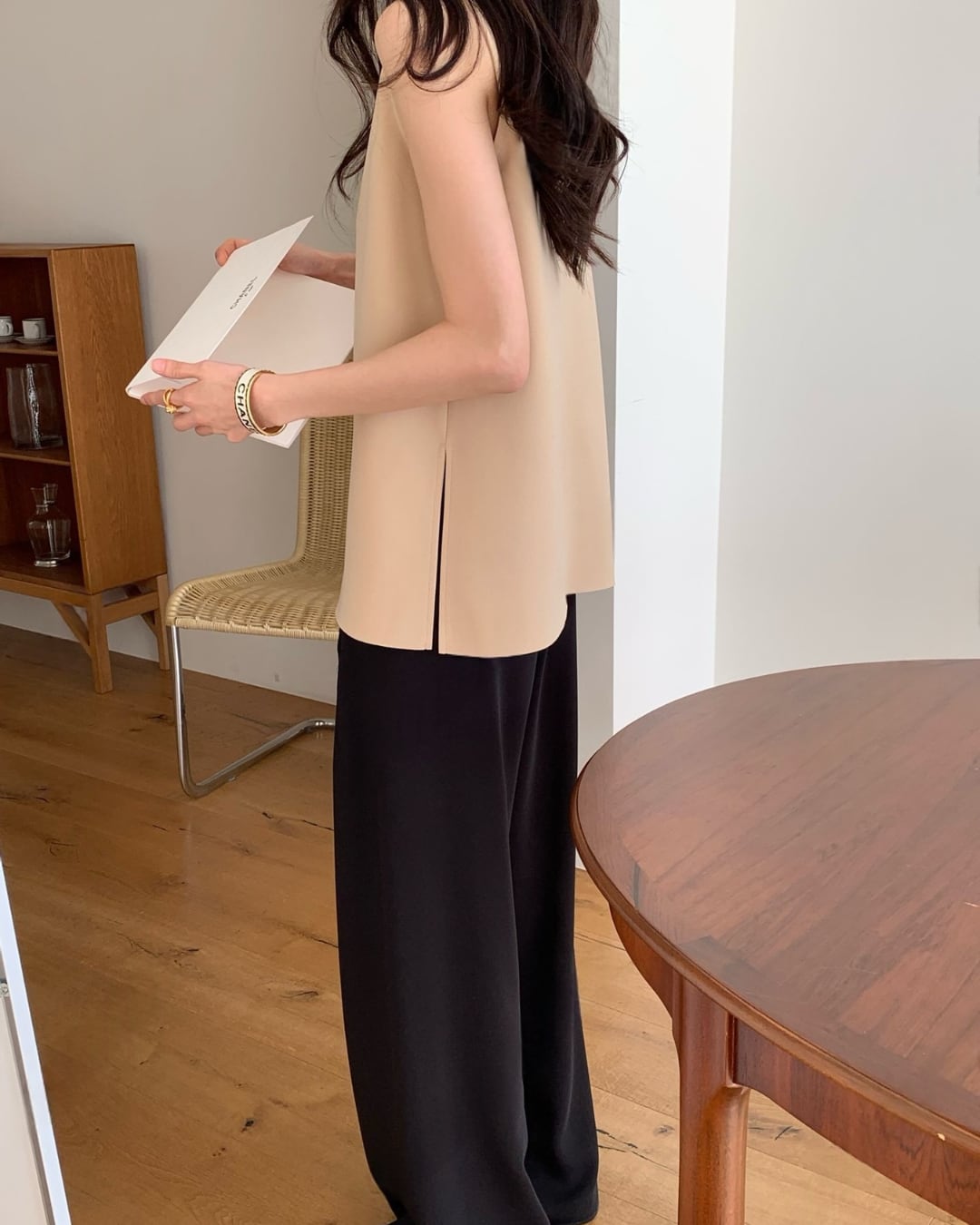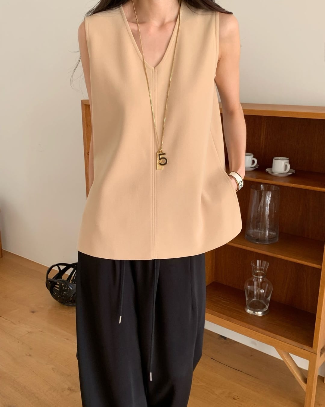 上品で洗練された印象を与えるVネックノースリーブブラウス。程よく広がるフレアシルエットとサイドスリットが、動きのある軽やかなスタイルを演出します。シンプルながらも女性らしさを引き立てるデザインで、スカートやパンツとも相性抜群。オンオフ問わず着回しできる万能アイテムです。