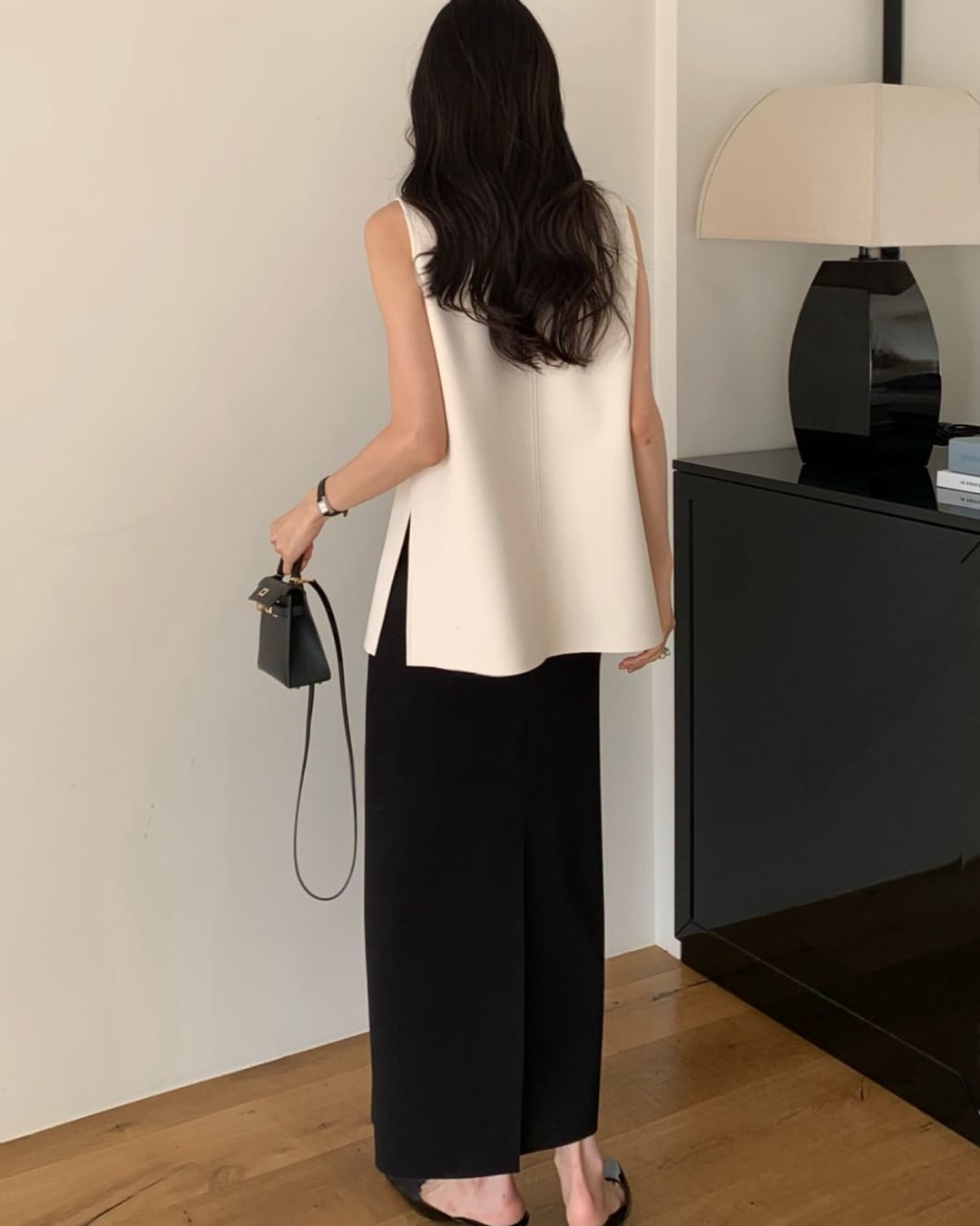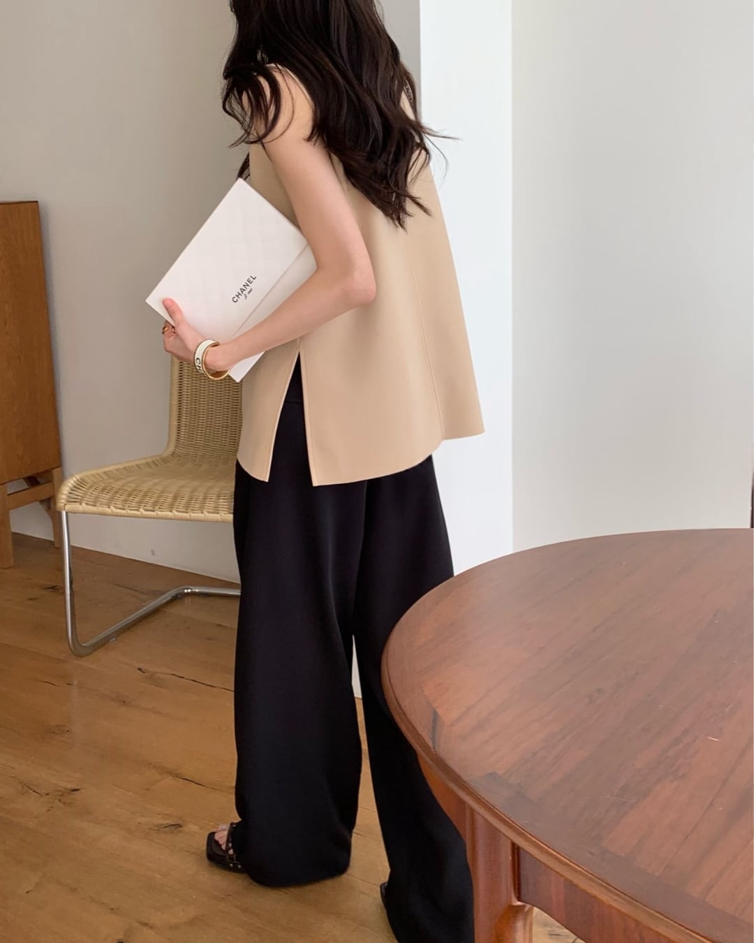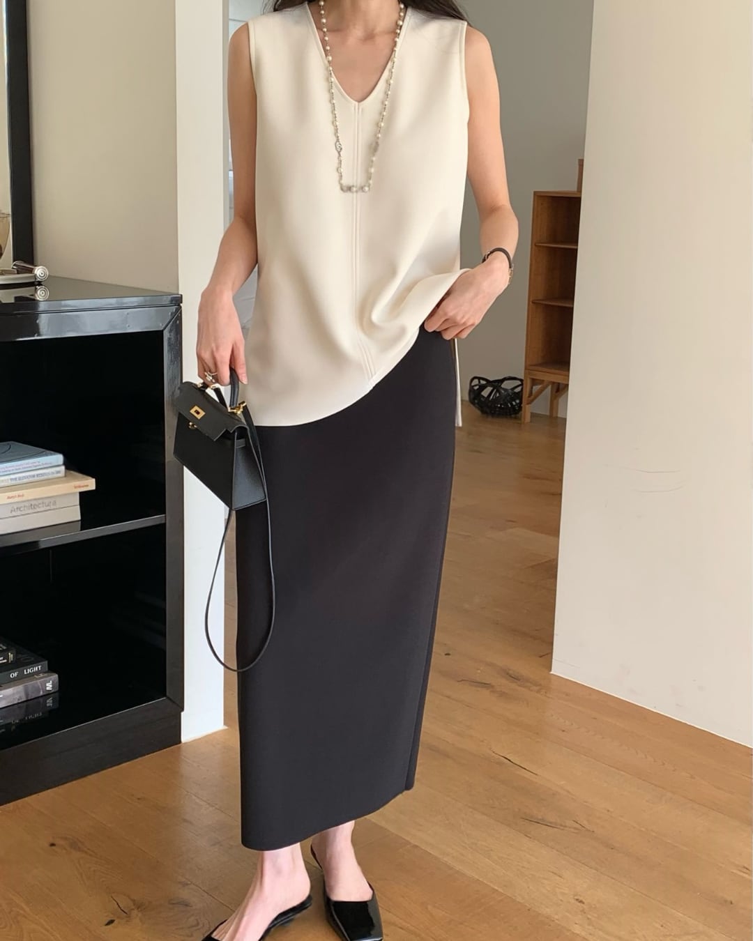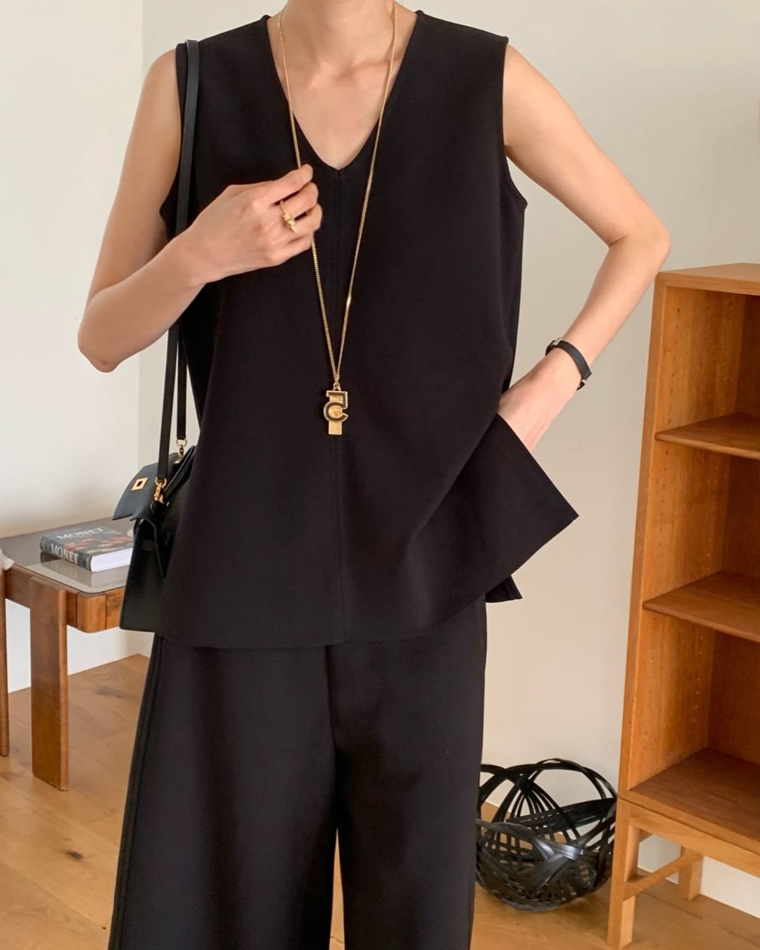 上品で洗練された印象を与えるVネックノースリーブブラウス。程よく広がるフレアシルエットとサイドスリットが、動きのある軽やかなスタイルを演出します。シンプルながらも女性らしさを引き立てるデザインで、スカートやパンツとも相性抜群。オンオフ問わず着回しできる万能アイテムです。