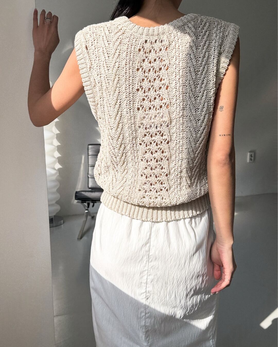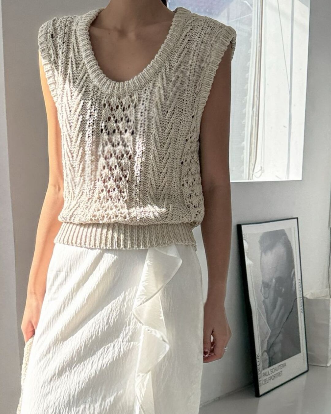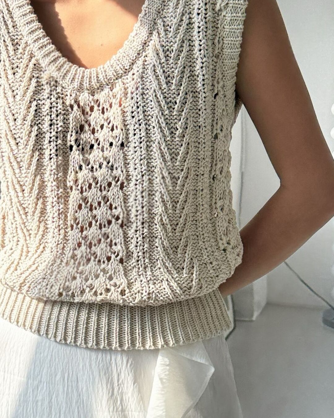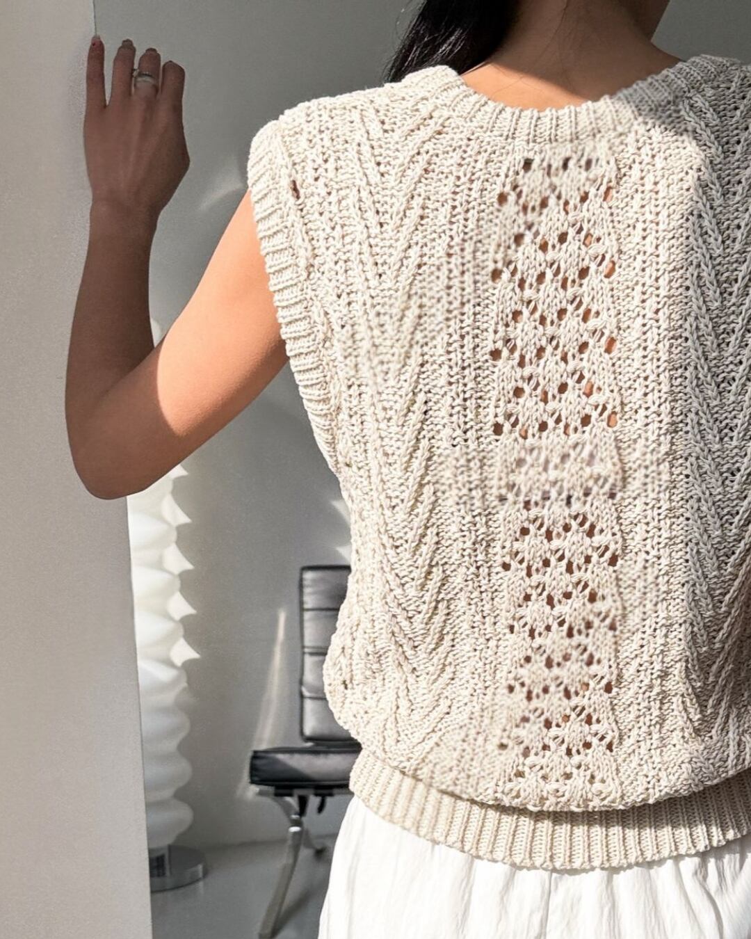 ナチュラルな風合いが魅力のコットン100%ニットベスト。立体感のあるケーブル編みと透かし編みデザインが上品な抜け感を演出します。深めのUネックで顔まわりをすっきり見せ、ノースリーブ仕様でレイヤードにもおすすめ。シャツやワンピース、タンクトップと合わせてロングシーズン活躍する一枚です。
