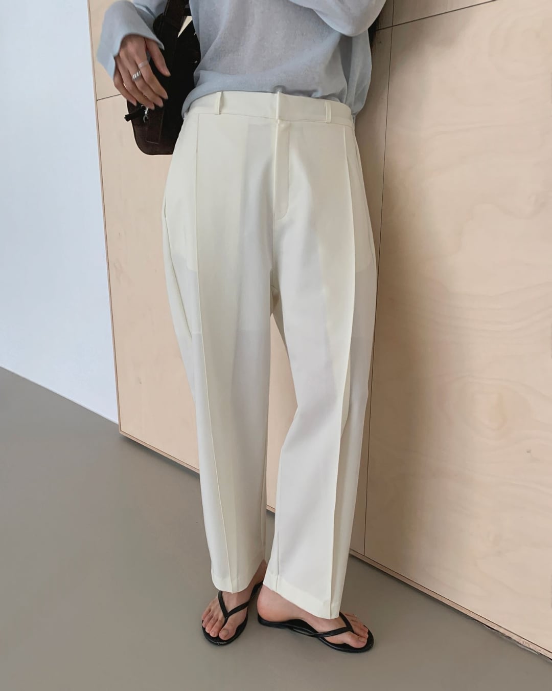 すっきりとしたラインで洗練された印象に仕上がるタック入りテーパードパンツ。フロントタックが腰まわりに程よいゆとりを与え、裾に向かって細くなるシルエットでスタイルアップ効果も期待できます。きれいめブラウスからカジュアルニットまで幅広く合わせやすく、オンオフ問わず活躍する万能アイテムです。