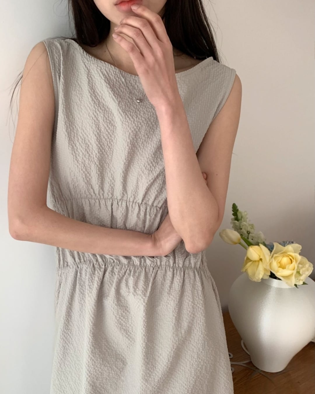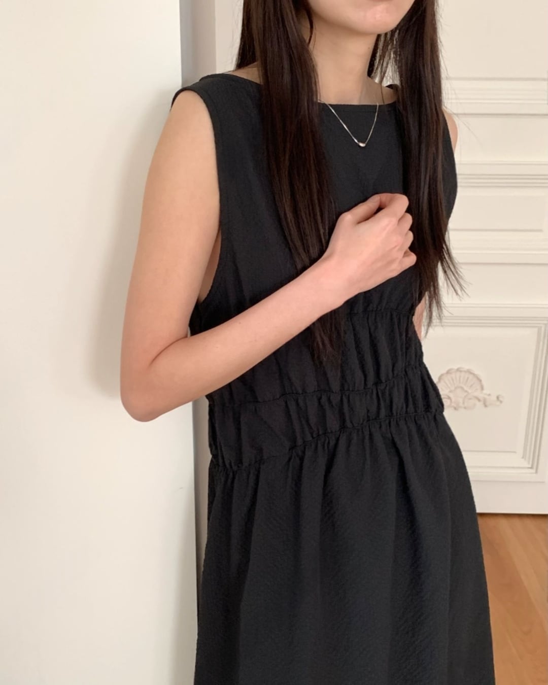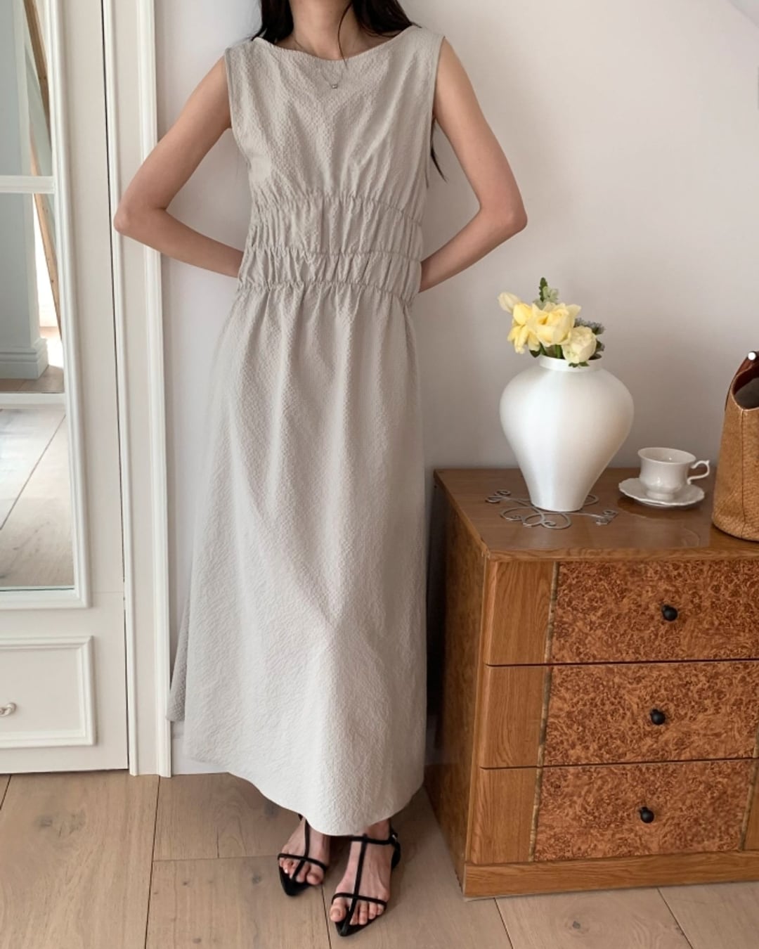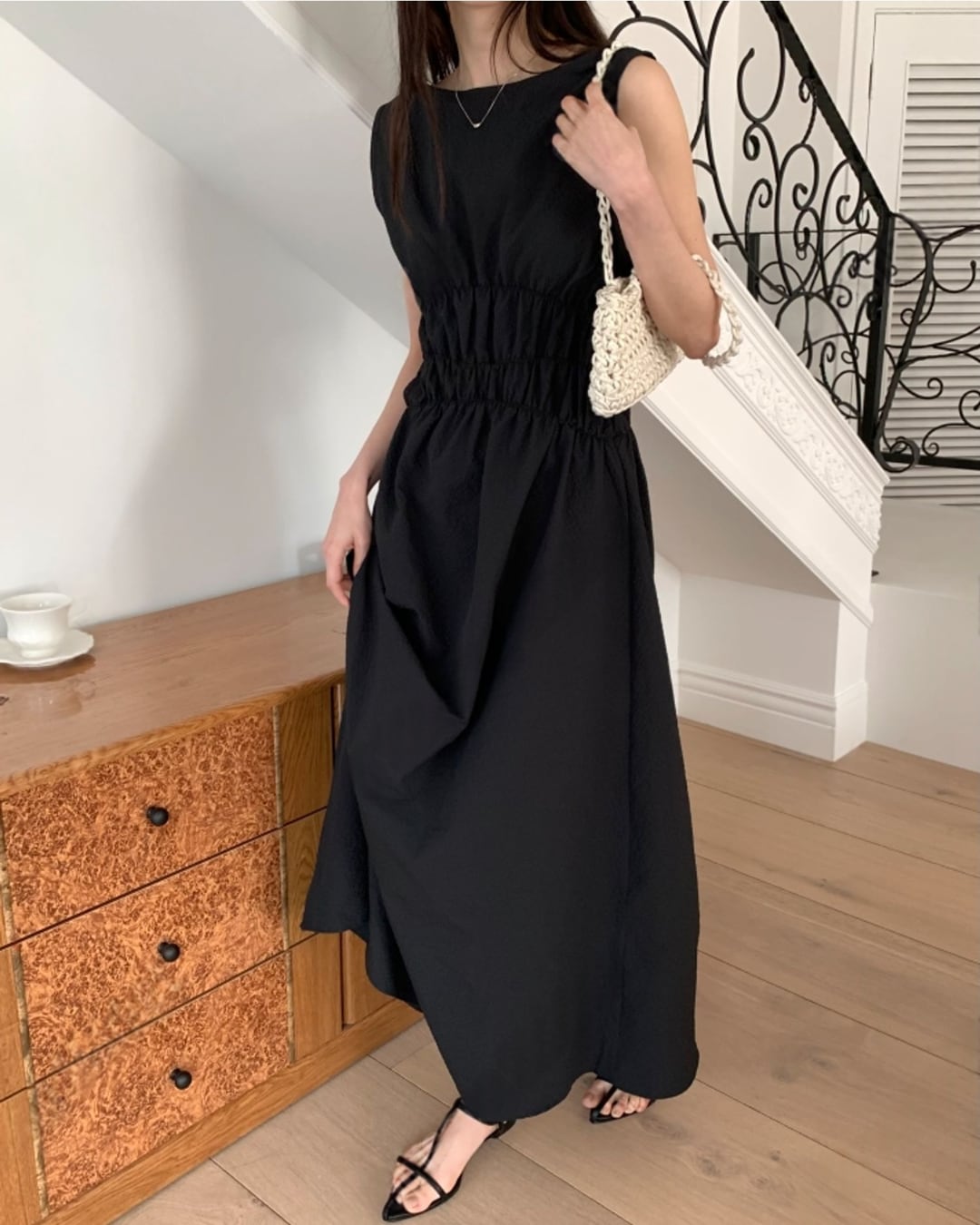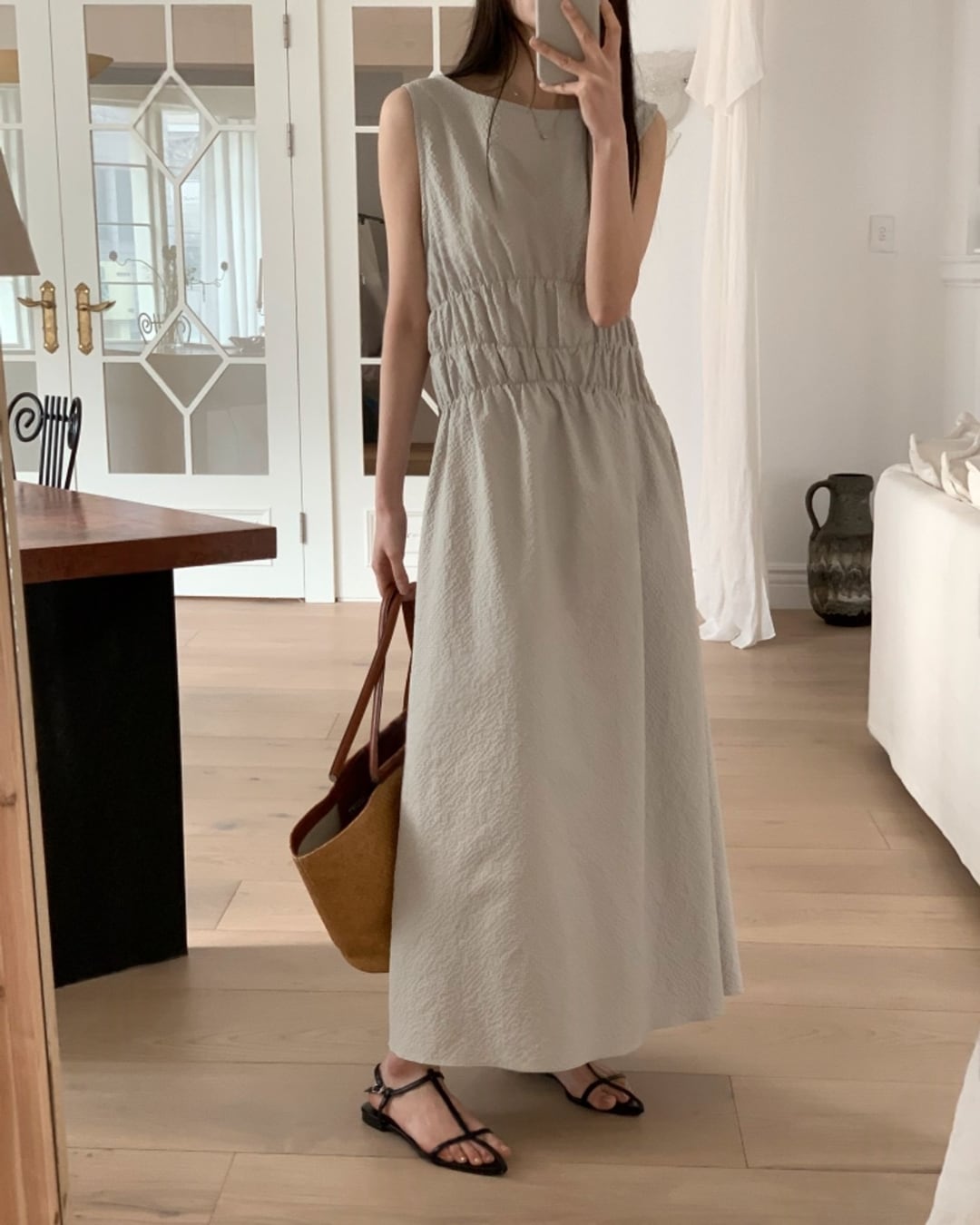 #ロングワンピース #ノースリーブワンピース #シャーリングワンピース #フレアワンピース #大人カジュアル