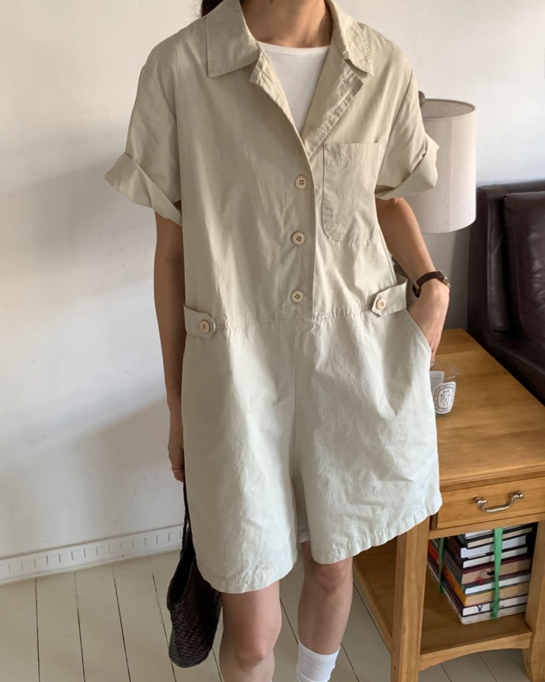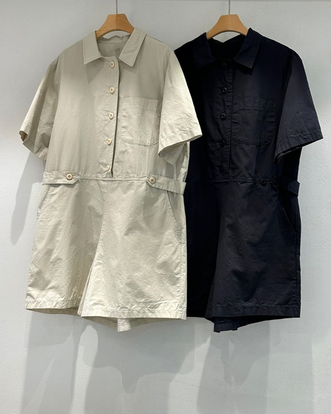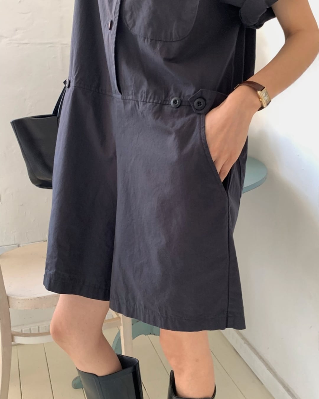 さらっとした軽やかなコットン素材で仕立てたショートスリーブオールインワン。ゆったりとしたシルエットが抜け感を演出し、1枚でこなれた大人カジュアルスタイルが完成します。開襟デザインとフロントボタン仕様で、すっきりとした印象に。ポケット付きで実用性もあり、デイリーからお出かけまで幅広く活躍する一着です。