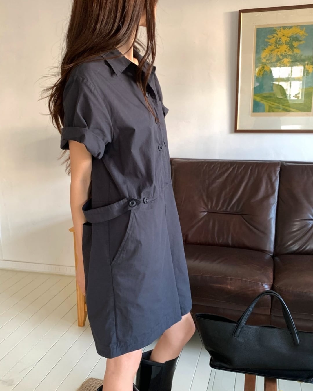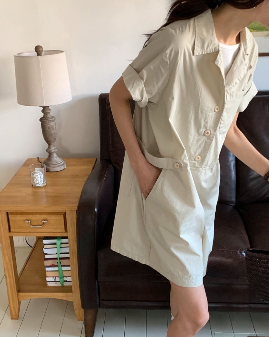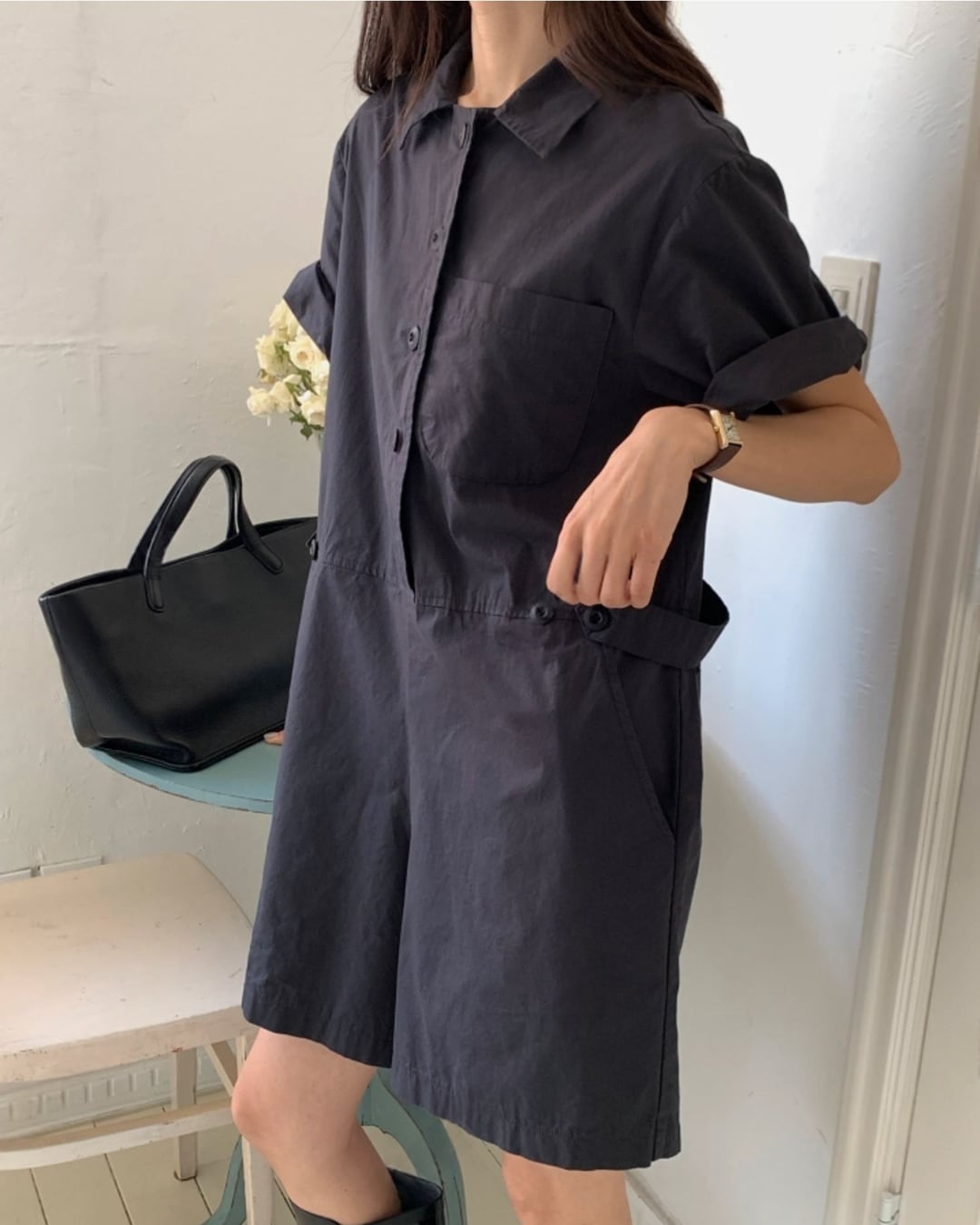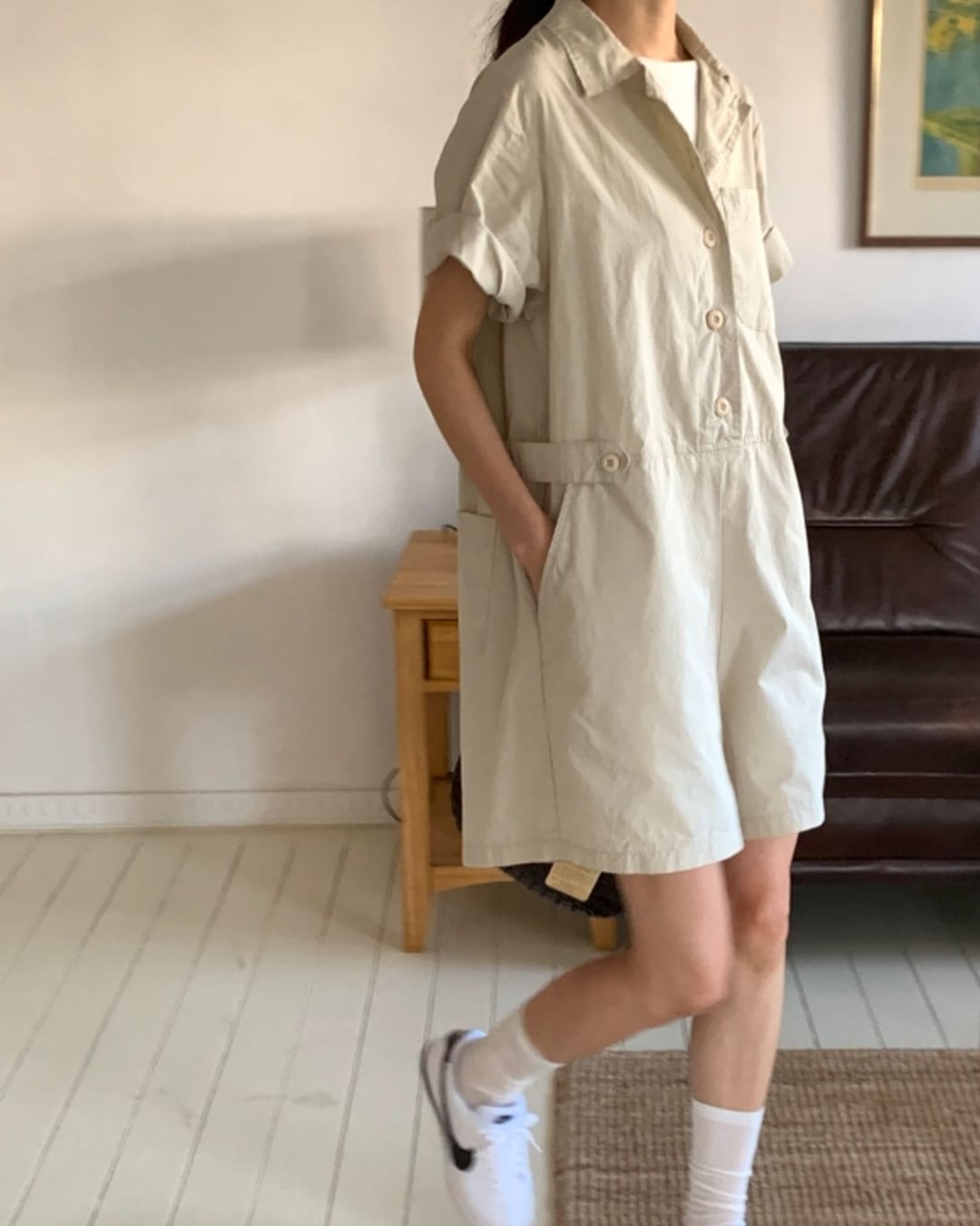 さらっとした軽やかなコットン素材で仕立てたショートスリーブオールインワン。ゆったりとしたシルエットが抜け感を演出し、1枚でこなれた大人カジュアルスタイルが完成します。開襟デザインとフロントボタン仕様で、すっきりとした印象に。ポケット付きで実用性もあり、デイリーからお出かけまで幅広く活躍する一着です。