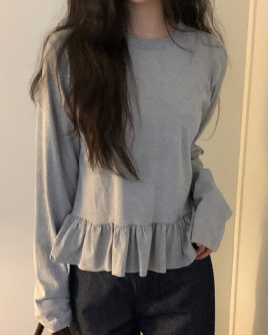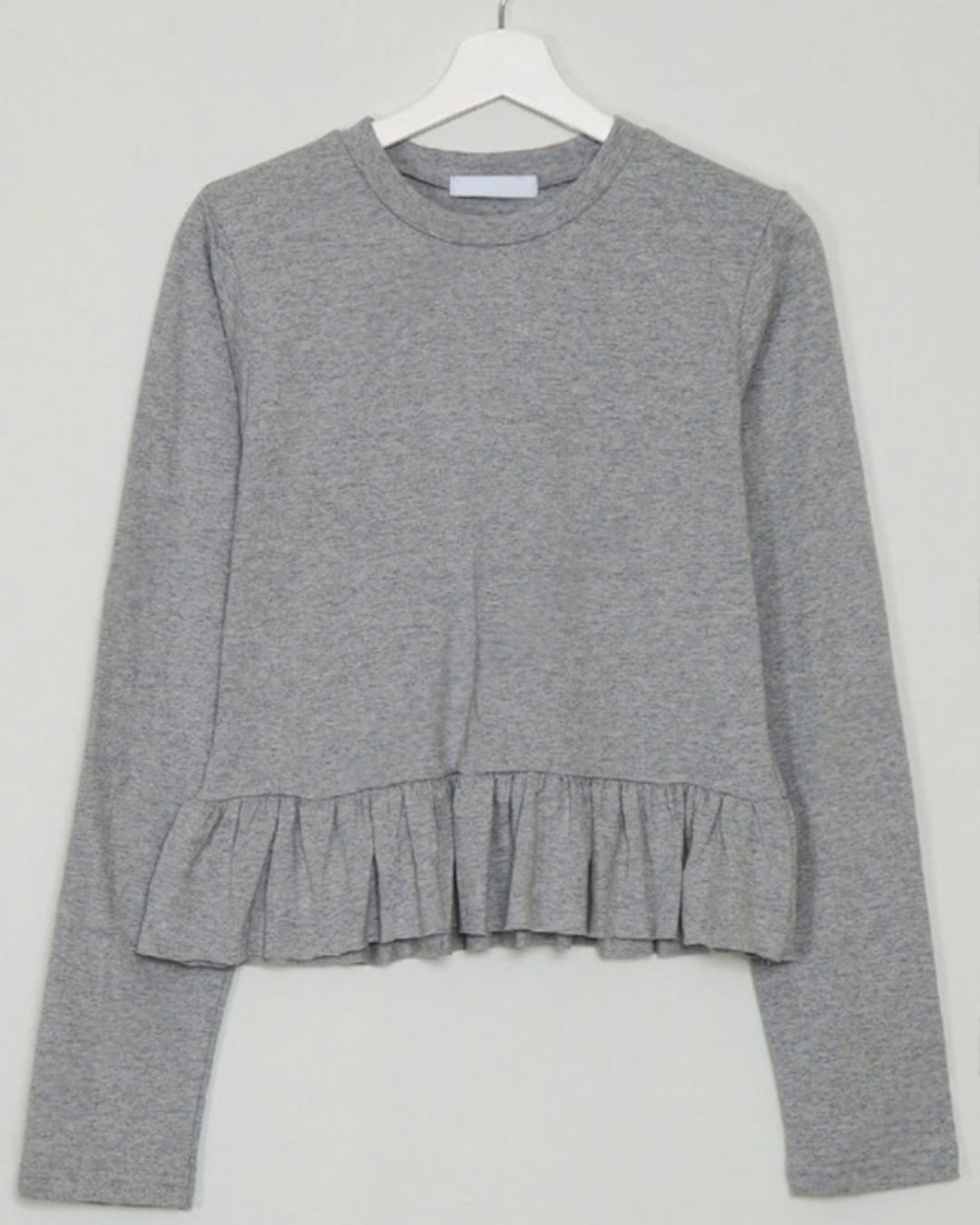 シンプルなトップスに裾フリルをあしらった、大人フェミニンな長袖プルオーバー。ふんわり広がるペプラムシルエットが女性らしさを引き立て、気になるウエスト周りも自然にカバーしてくれます。パンツ合わせで甘さを抑えたスタイリングがおすすめの着映えトップスです。