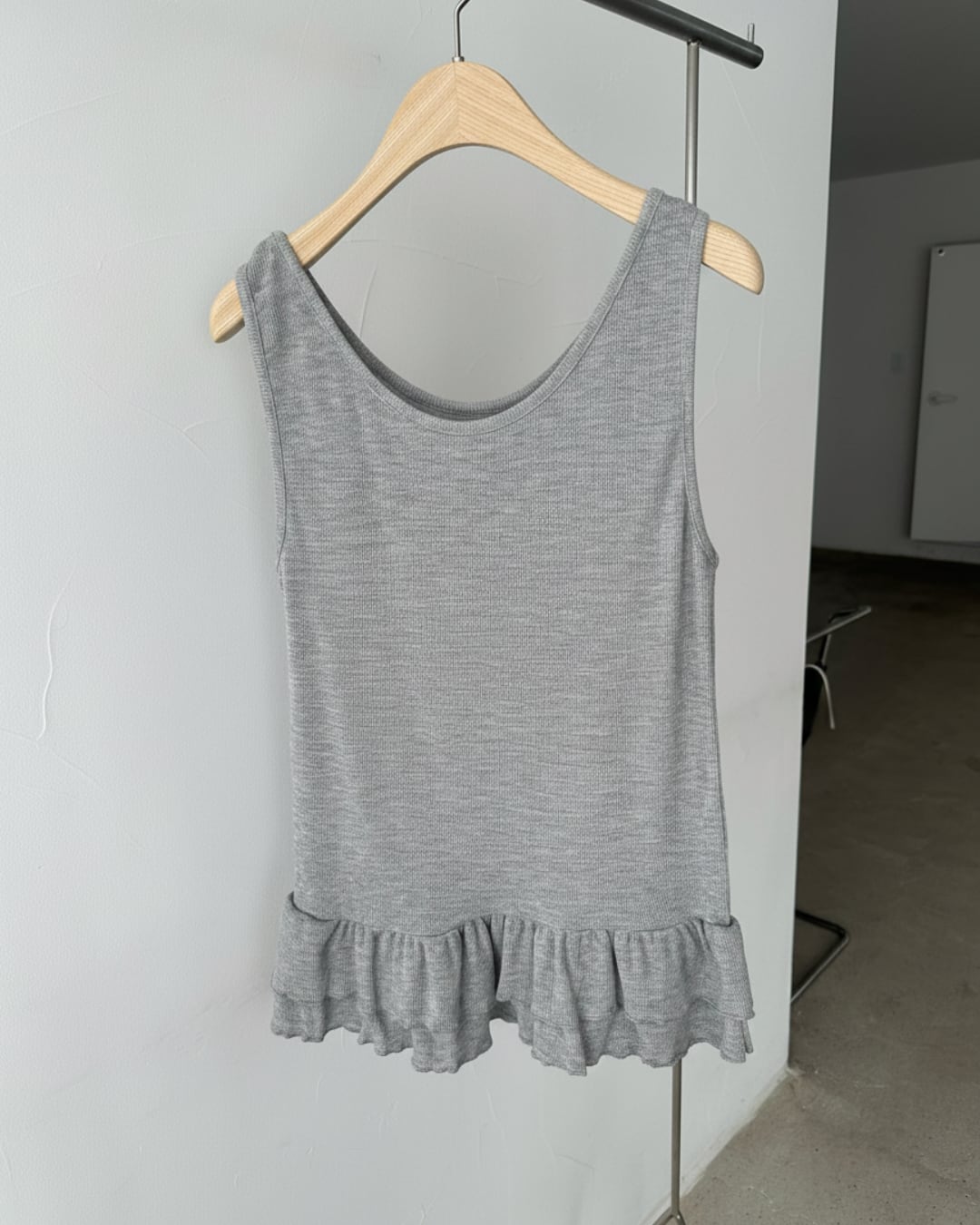 柔らかなリブ素材で仕立てた、女性らしさ引き立つタンクトップ。裾にあしらった二段フリルが華やかなアクセントになり、シンプルながらも着映えするデザインです。程よくフィットするシルエットで、デニムやスラックス、スカートまで幅広いボトムスと好相性。1枚ではもちろん、シャツやカーディガンのインナー使いにもおすすめです。