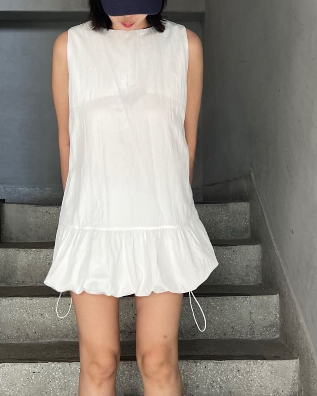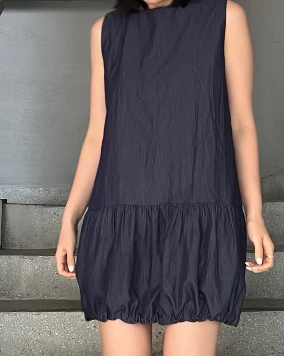 ふんわりと丸みのあるバルーンヘムデザインが目を惹く、トレンド感たっぷりのノースリーブミニワンピース。シンプルな身頃とのバランスが洗練された印象を演出し、一枚でこなれたスタイルが完成します。軽やかな素材感で着心地も良く、レイヤードスタイルにもおすすめ。パンツやレースレギンスとの重ね着で幅広い着こなしが楽しめるアイテムです。