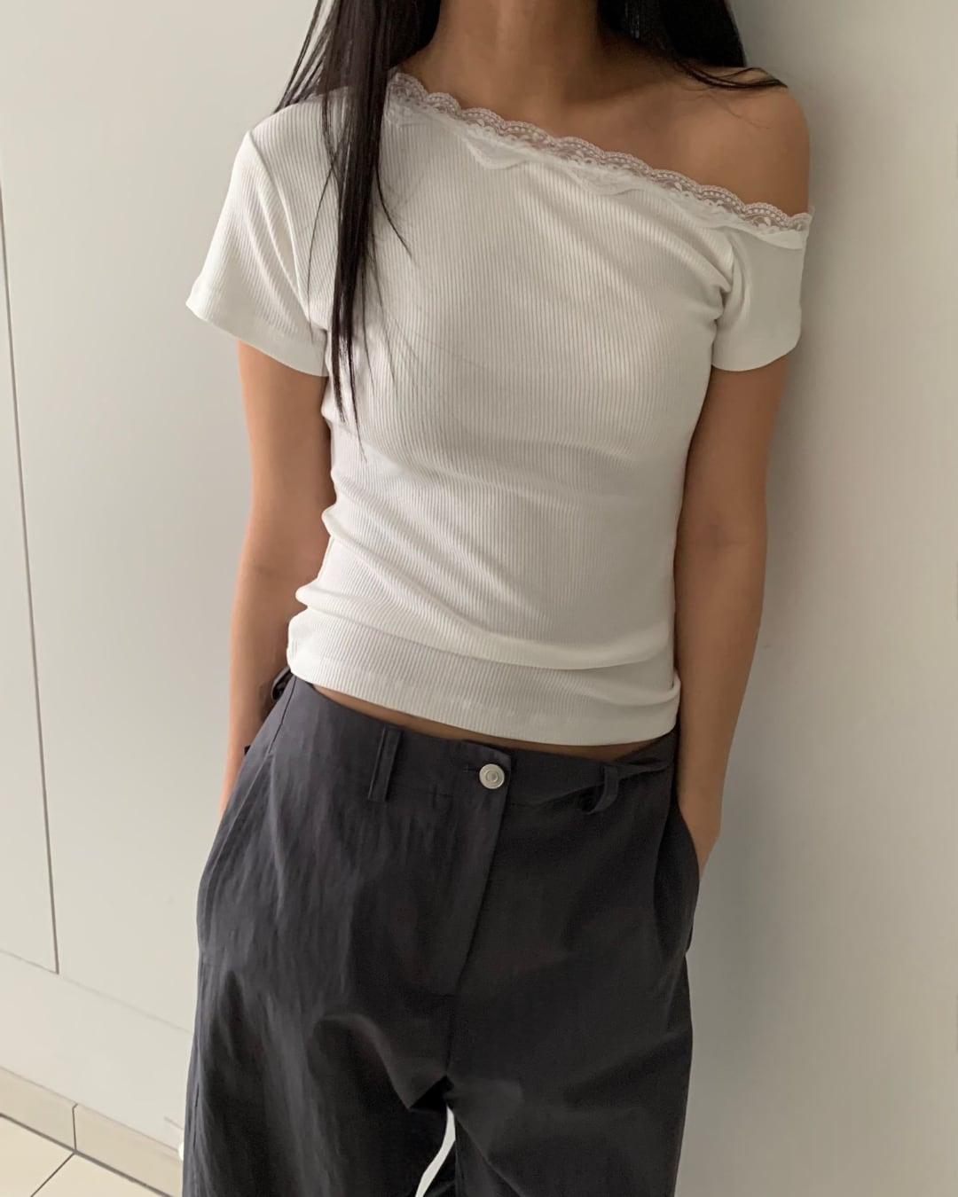 #ワンショルダー #リブトップス #レースデザイン #半袖トップス #大人フェミニン