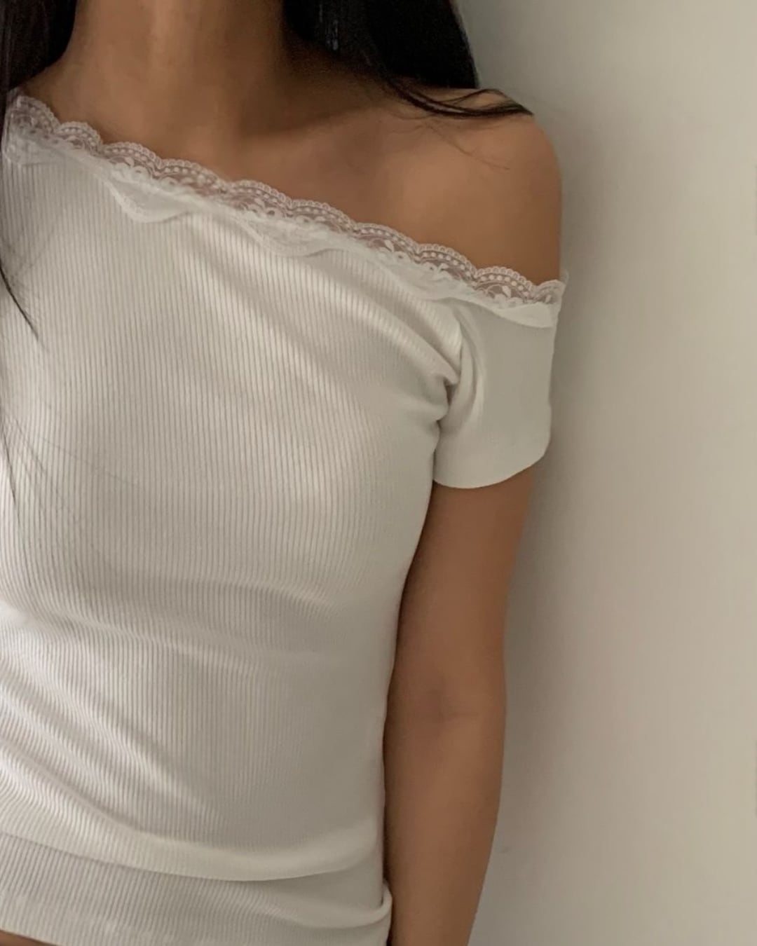 レースワンショルダーリブトップス