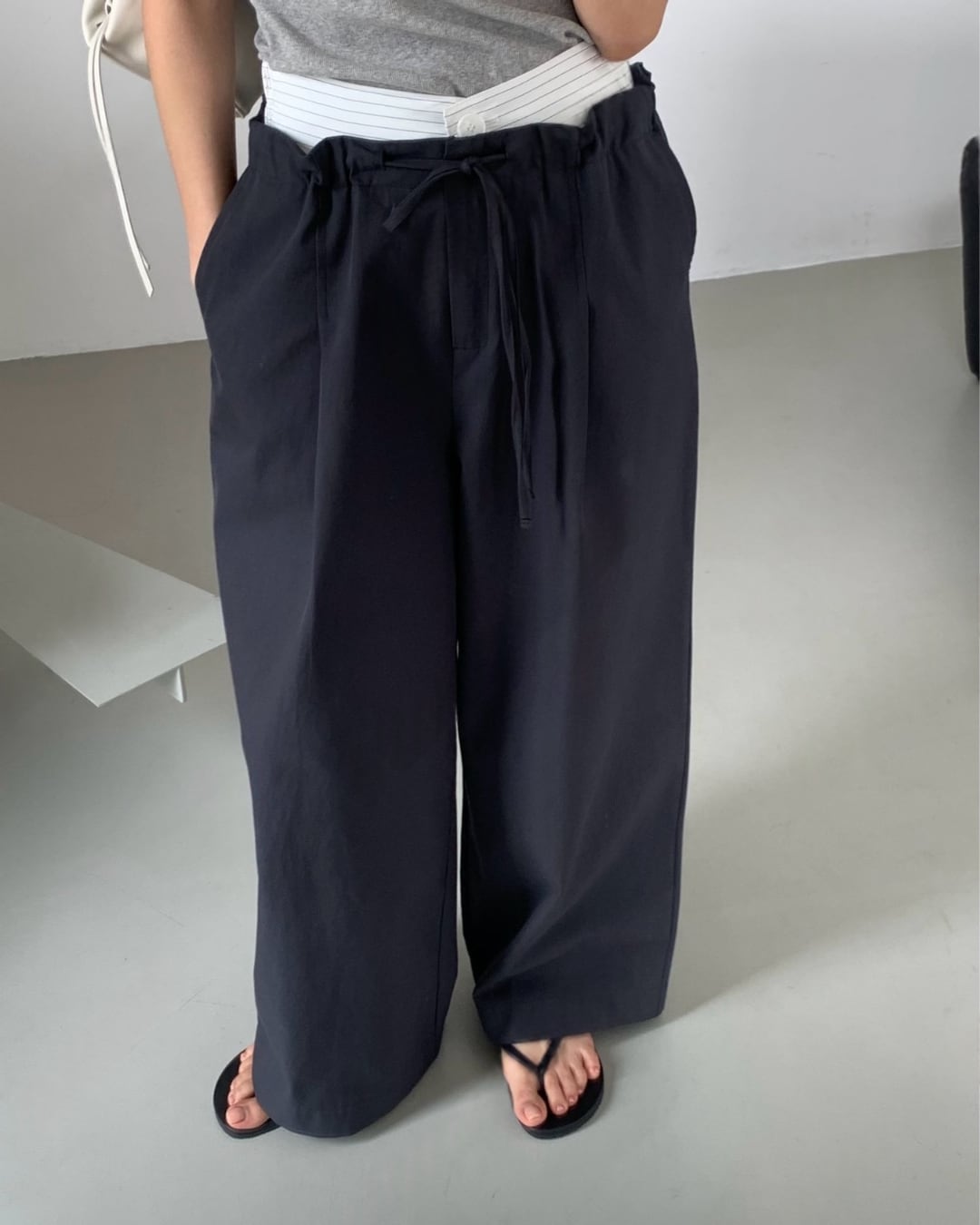 折り返しデザインのバイカラーウエストが目を惹くワイドパンツ。ゆったりとしたシルエットで抜け感があり、ウエストのリボンがさりげないアクセントに。シンプルなトップスと合わせるだけで、こなれ感のあるスタイリングが完成します。