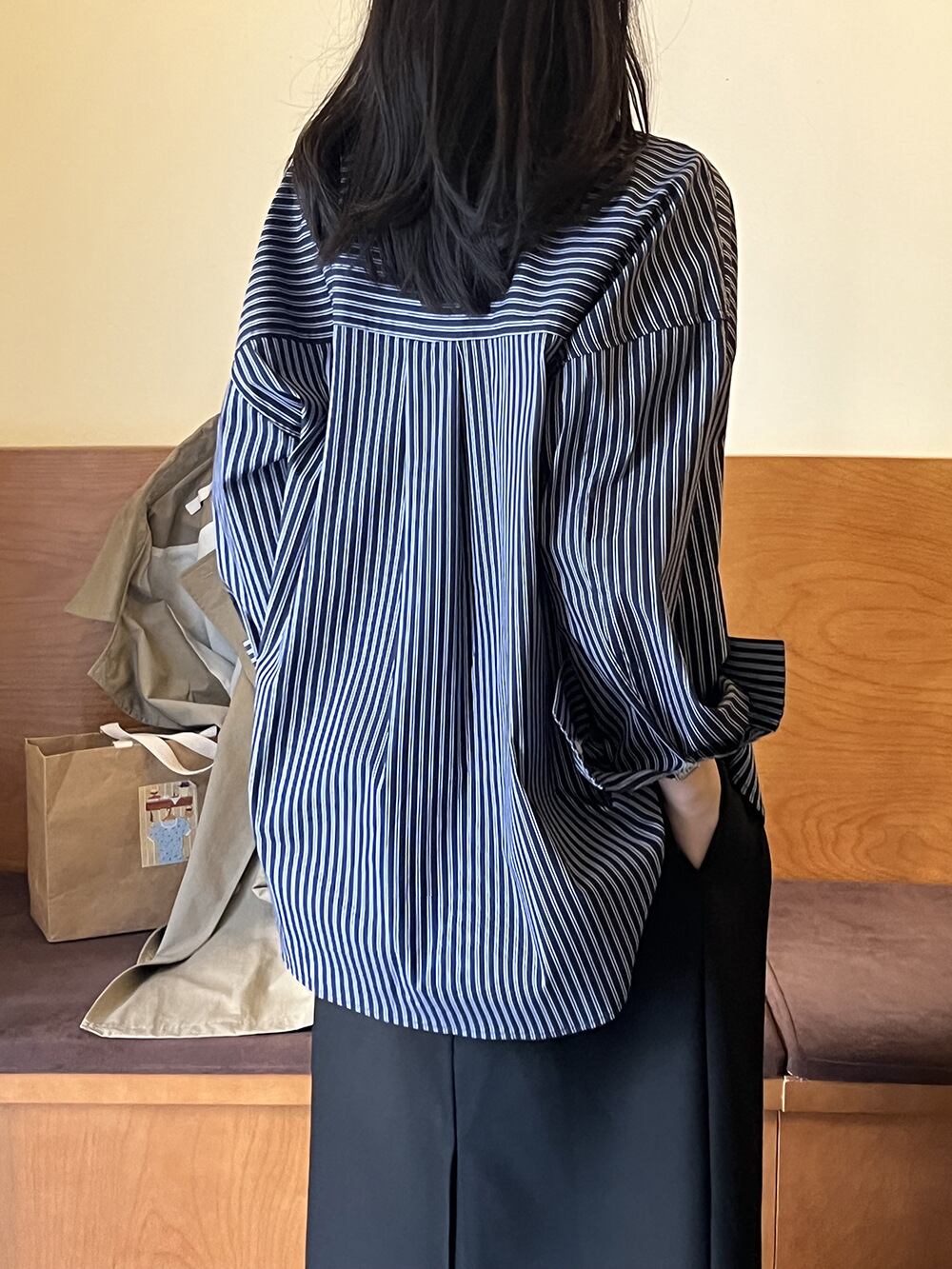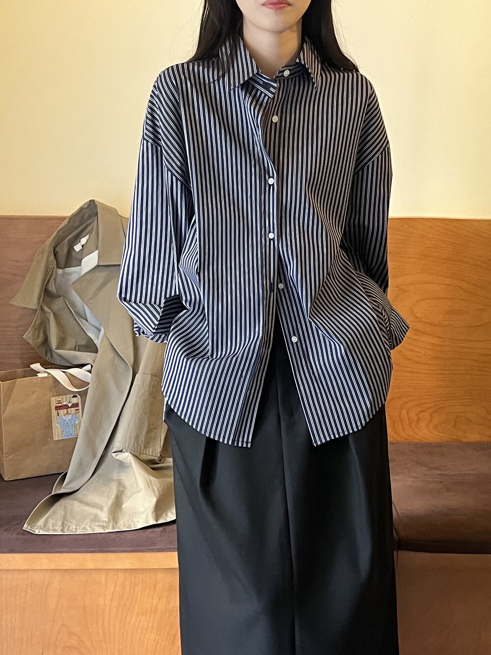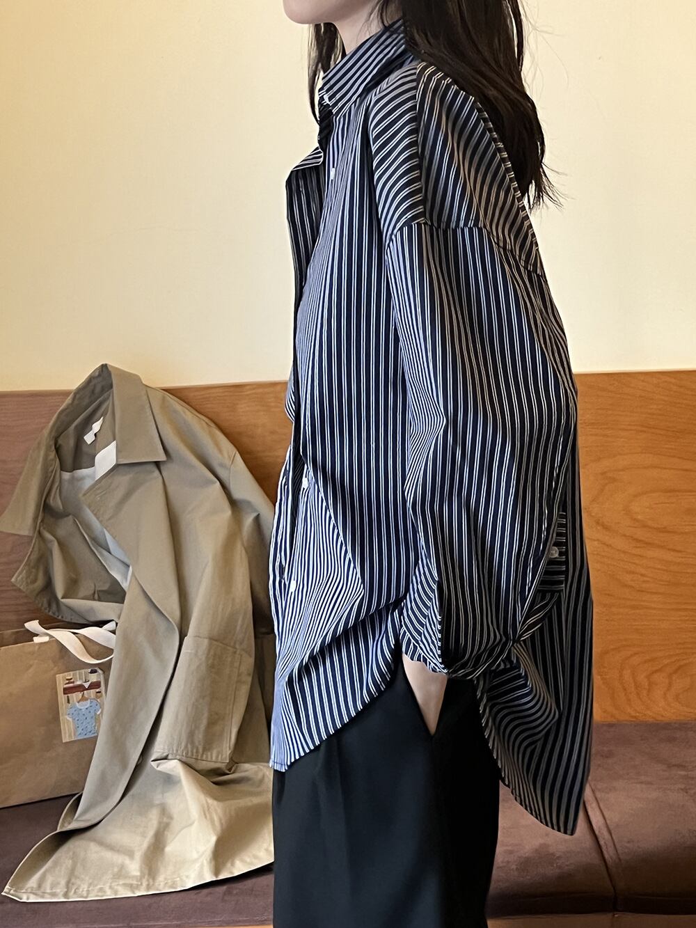 シンプルでありながらもおしゃれな一枚。ストライプ柄が程よいアクセントになり、カジュアルな中にも上品さを演出します。襟元や袖口のルーズ感のあるデザインが程よいアクセントになり、着こなしを引き締めます。