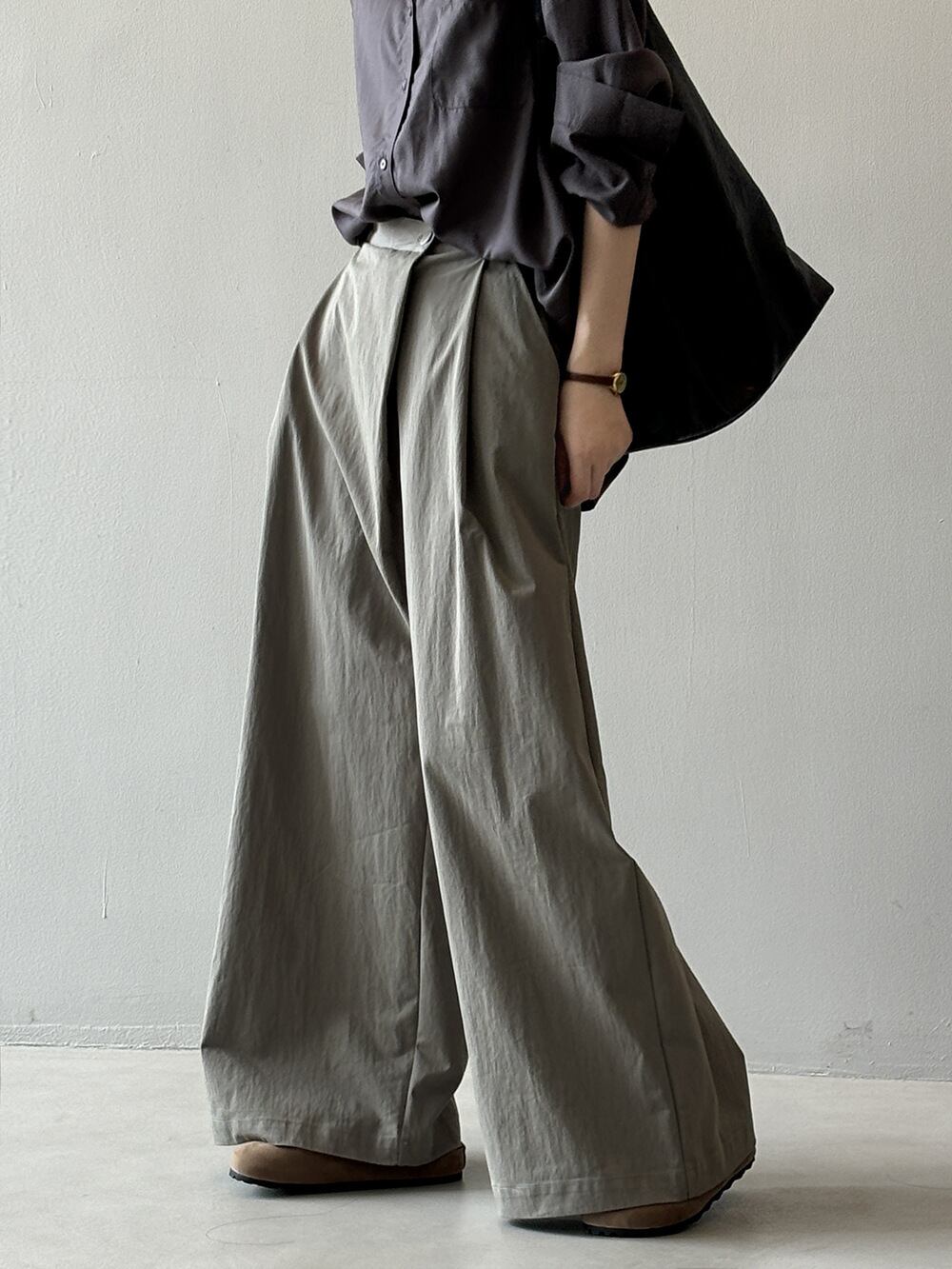 シンプルながらも上品さを漂わせる一品です。タック入りのデザインが脚のラインを美しく見せ、ゆったりとしたシルエットが楽な穿き心地を提供します。オフィスシーンはもちろん、カジュアルな日常使いにもベストマッチなアイテムです。