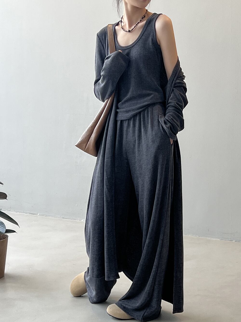 快適さとスタイルを両立させたゆったりルームウェア3点セットです。リラックスした時間を楽しむためのアイテムとして、家庭でのんびり過ごす時や、軽い外出にも最適です。柔らかい素材感とゆったりとしたシルエットが、心地よい着心地を実現しており、普段使いからリラックスタイムに至るまで幅広くご活用いただけます。