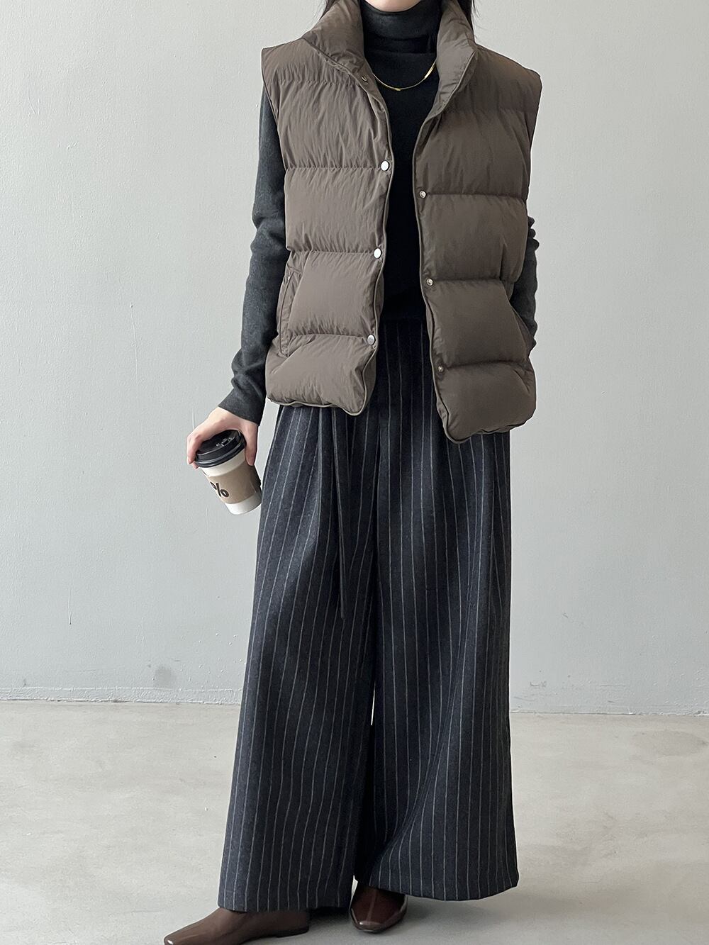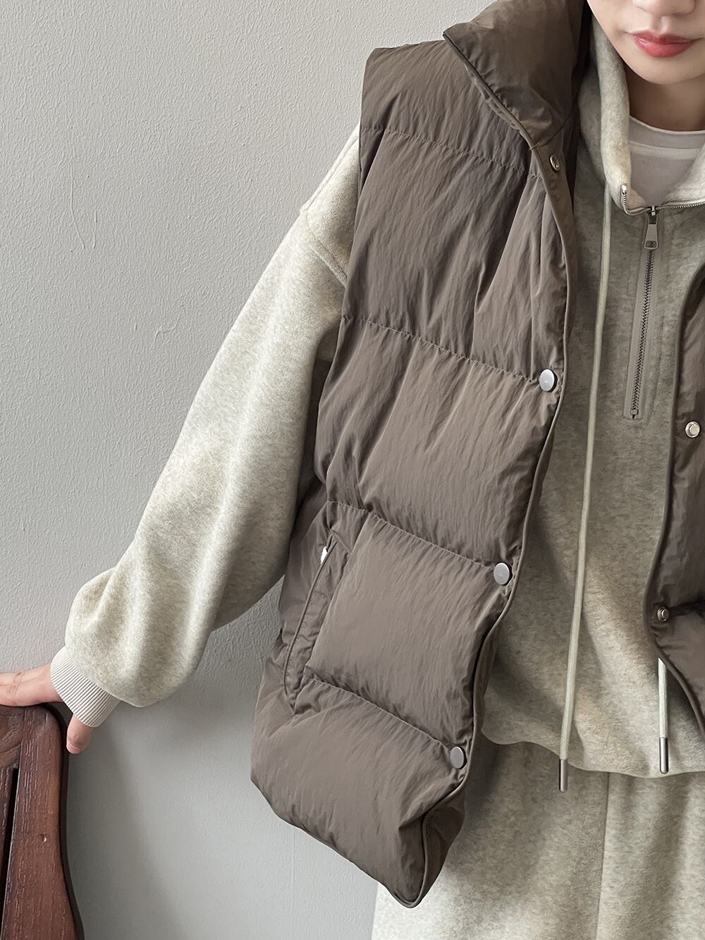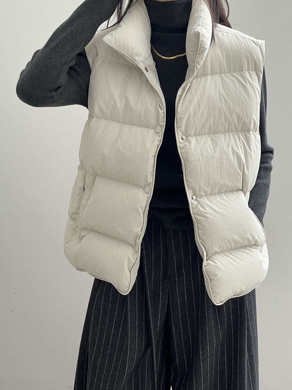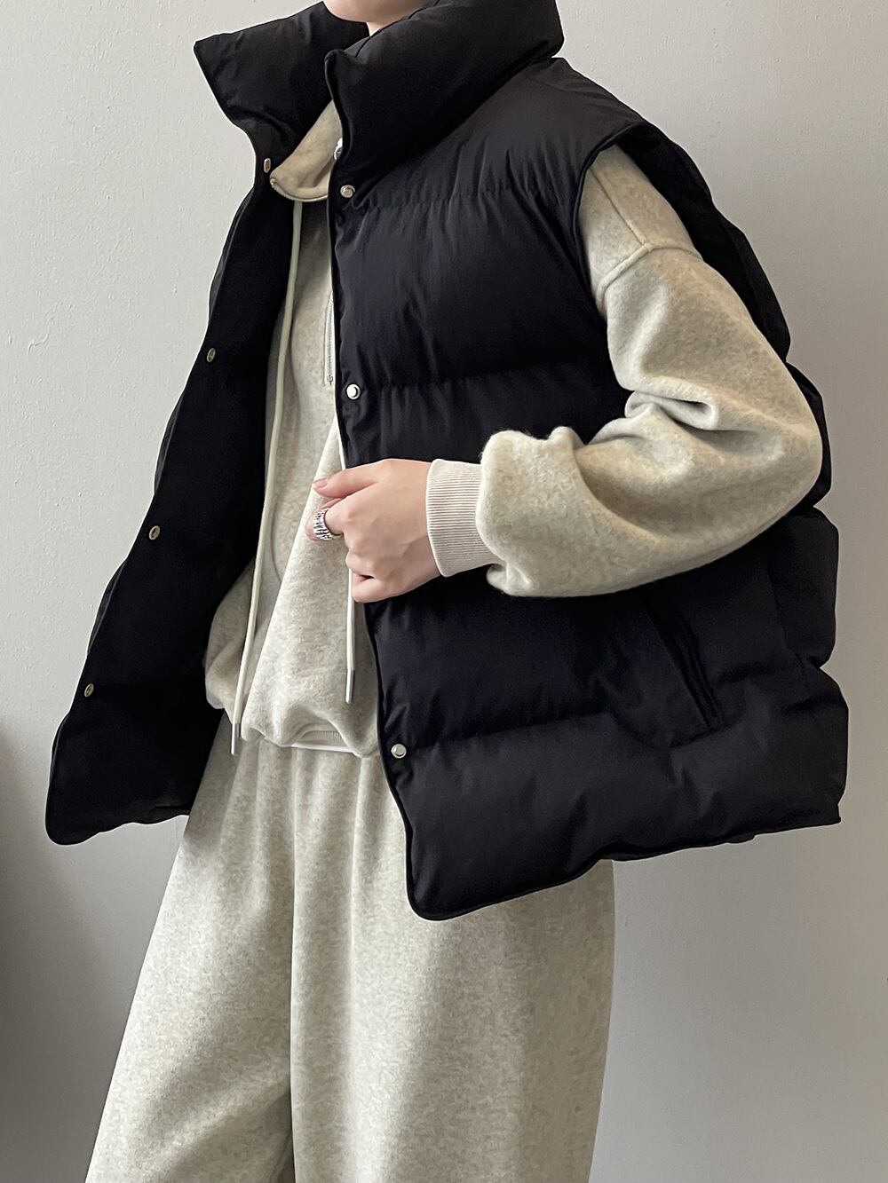 シンプルでいて洗練された印象のハイネックシンプルダウンベスト。ボリューム感があり、アクティブな日常から休日のお出かけまで、幅広いシーンで活躍します。意外とコーディネートしやすく、カジュアルからスマートカジュアルまで、様々なスタイルにフィットします。