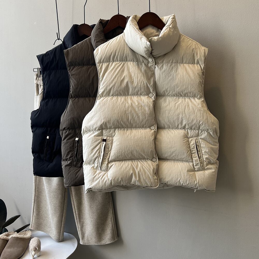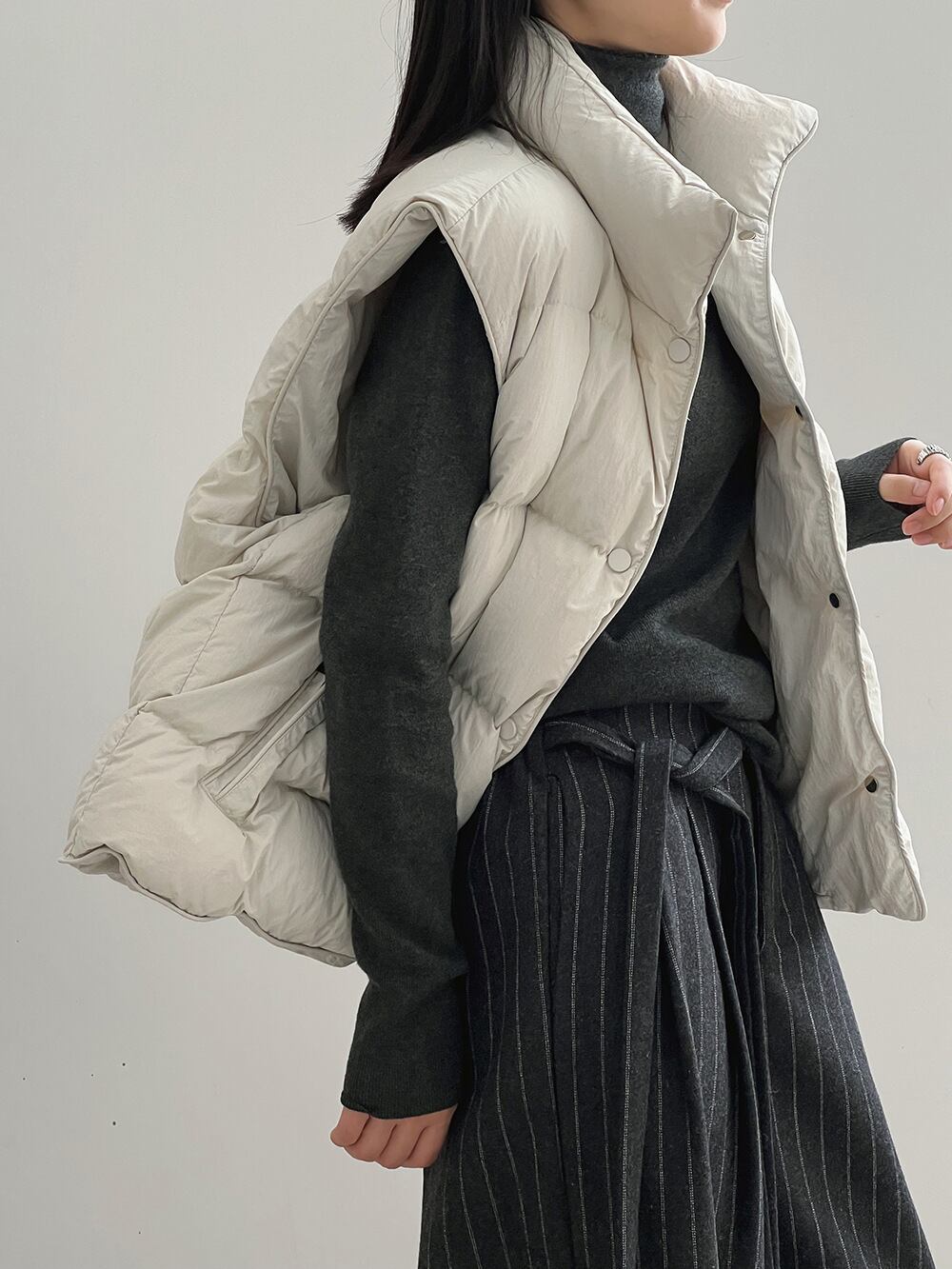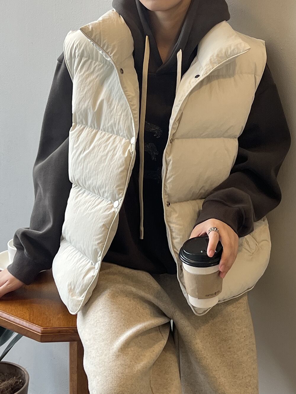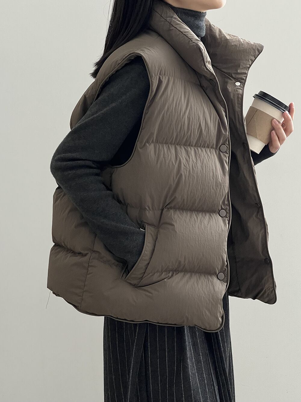 シンプルでいて洗練された印象のハイネックシンプルダウンベスト。ボリューム感があり、アクティブな日常から休日のお出かけまで、幅広いシーンで活躍します。意外とコーディネートしやすく、カジュアルからスマートカジュアルまで、様々なスタイルにフィットします。